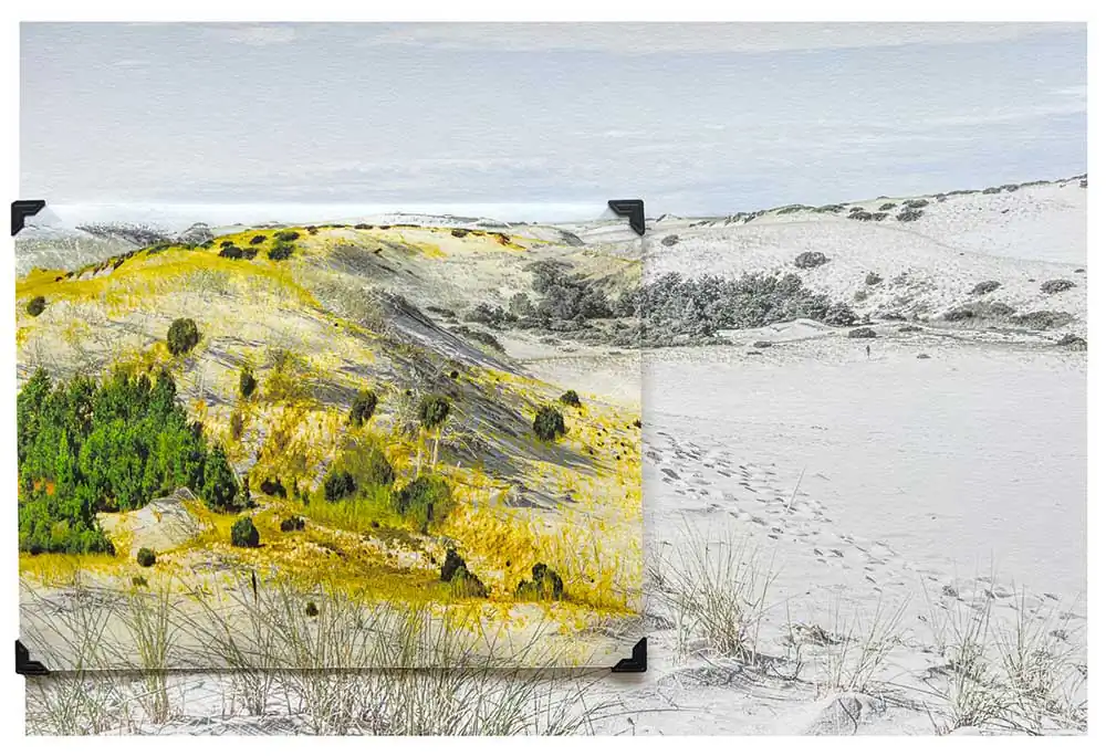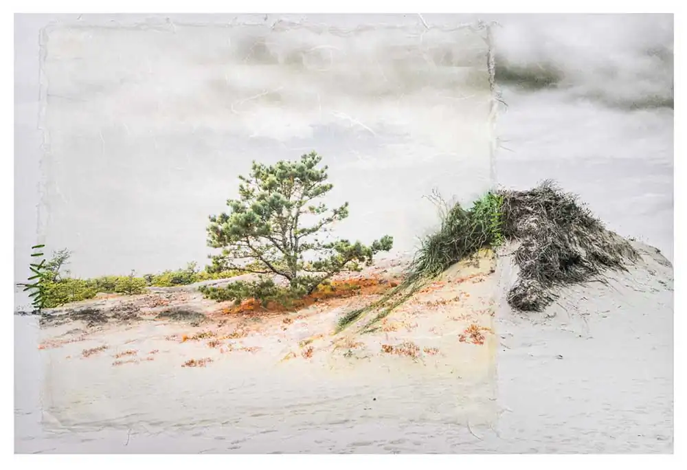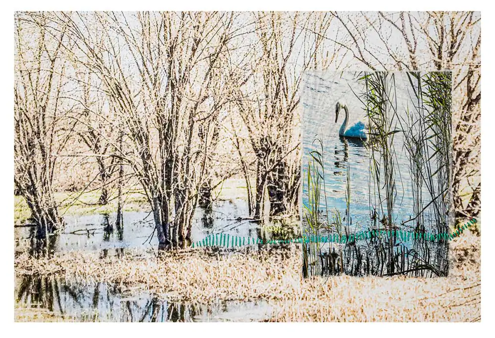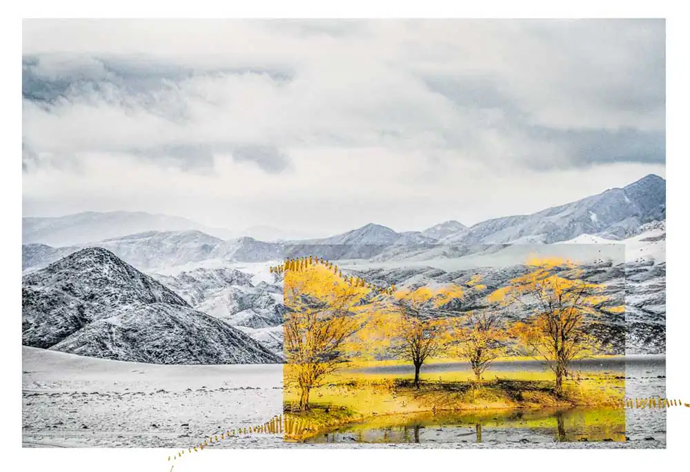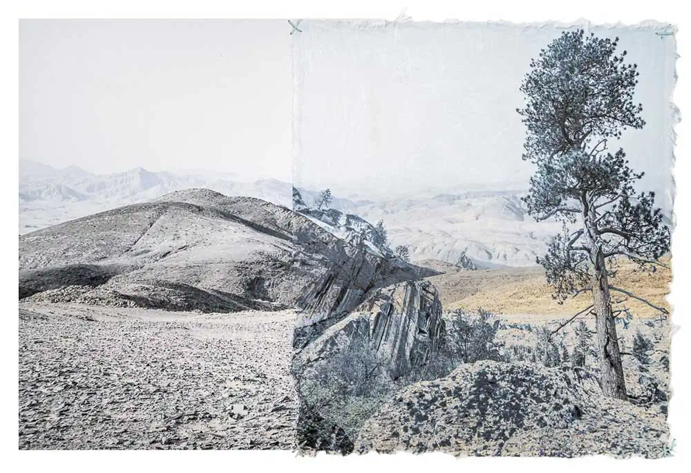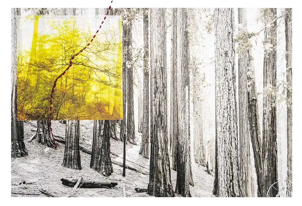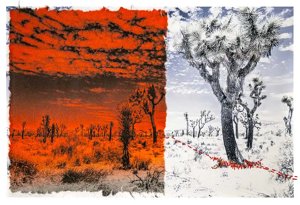 Environmental Melancholia uses visual metaphors to celebrate the natural world and highlight the precariousness of our global ecological system. The purpose is to represent and titrate overwhelming fear about the climate into manageable doses and thus facilitate a transformation in the viewer from a passive bystander stuck in environmental melancholia to an active witness who can engage with the urgent narrative of the climate crisis. Inspired by and reacting to the idealized allure of the Hudson River School, the photographs are pictorial and idyllic at first glance. But a closer look punctures the sublime by revealing a photograph of a flourishing nature scene on rice paper affixed to a base print of a depleted environment, challenging observers to look beyond their expectations and ask, “Wait, what is happening here?”