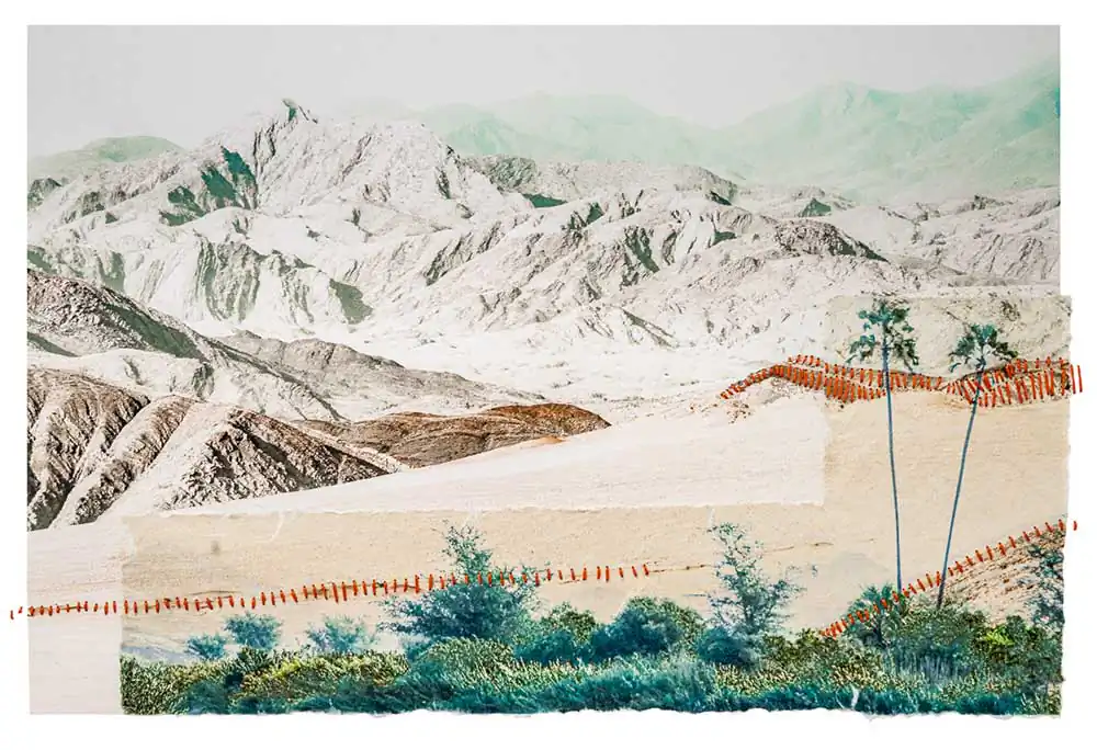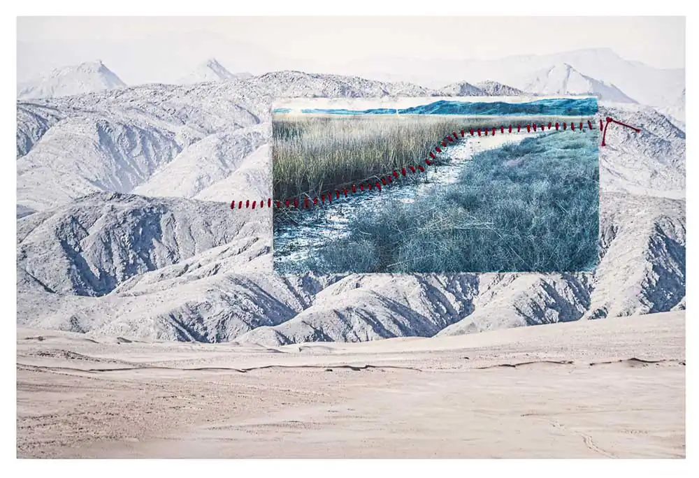 Our planet is in a precarious place, disintegrating as we lose glaciers, animals, trees, and fertile land. With this series, I attempt to stop things from vanishing, fix the harm, restore the losses, and put the land back together. I tear natural resources from a photograph of another environment and hastily connect them to a depleted one with Japanese washi tape or embroidery thread, beckoning viewers to join me in a visceral experience of damage and repair. [Official Website]