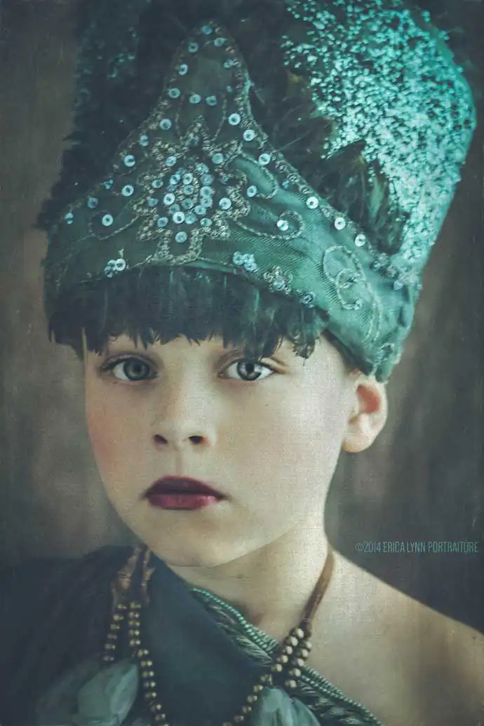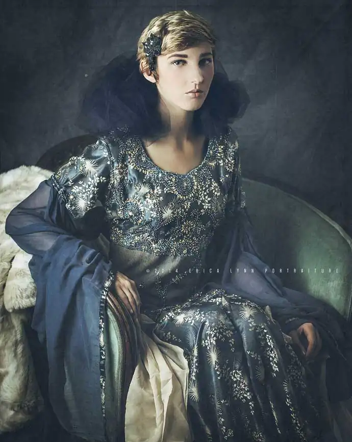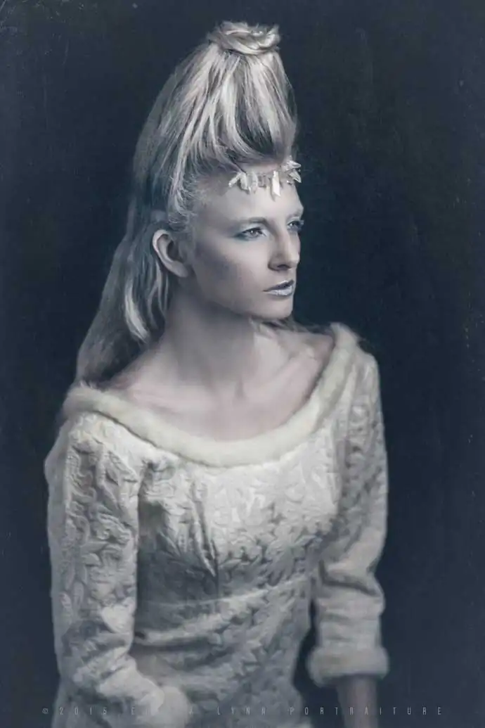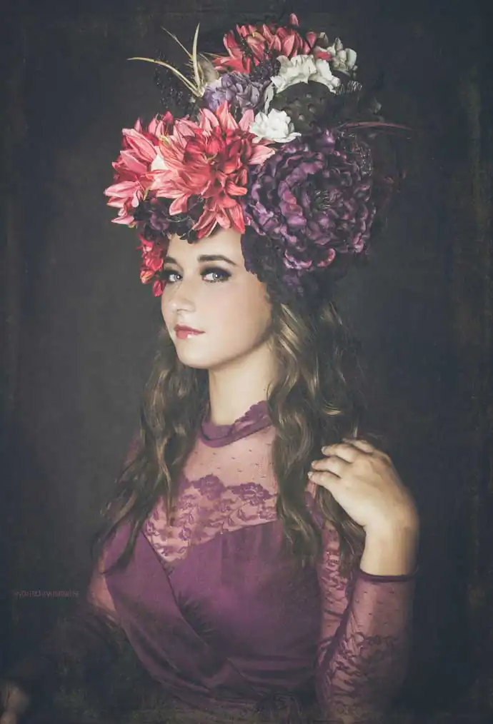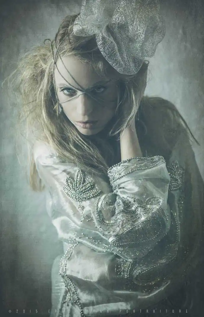 The concept behind this was is Marie Antoinette were Alice in Wonderland, that’s what it might look like. All of my shoots have themes, characters and stories behind them and I try to bring them to life in my work. The skirt she is wearing is a vintage hoop skirt from the 1950’s that I found at an estate sale and the headdress was designed and made by me. If you notice there is a bird at the top of the headdress and she is holding a cage, the concept behind that was that her bird escaped from the cage and she was panicking trying to find it. The backdrop was custom made by me to match the exact colors of her headdress so that the colors would all pull and pop in post processing. This set is lit with just one strobe that is set up on her left side and there are two black V-flats on her right side. I wanted to keep the lighting simple so that anyone attending my workshop could easily duplicate this lighting themselves and achieve the same look. I shoot almost all of my work with only one or two lights.