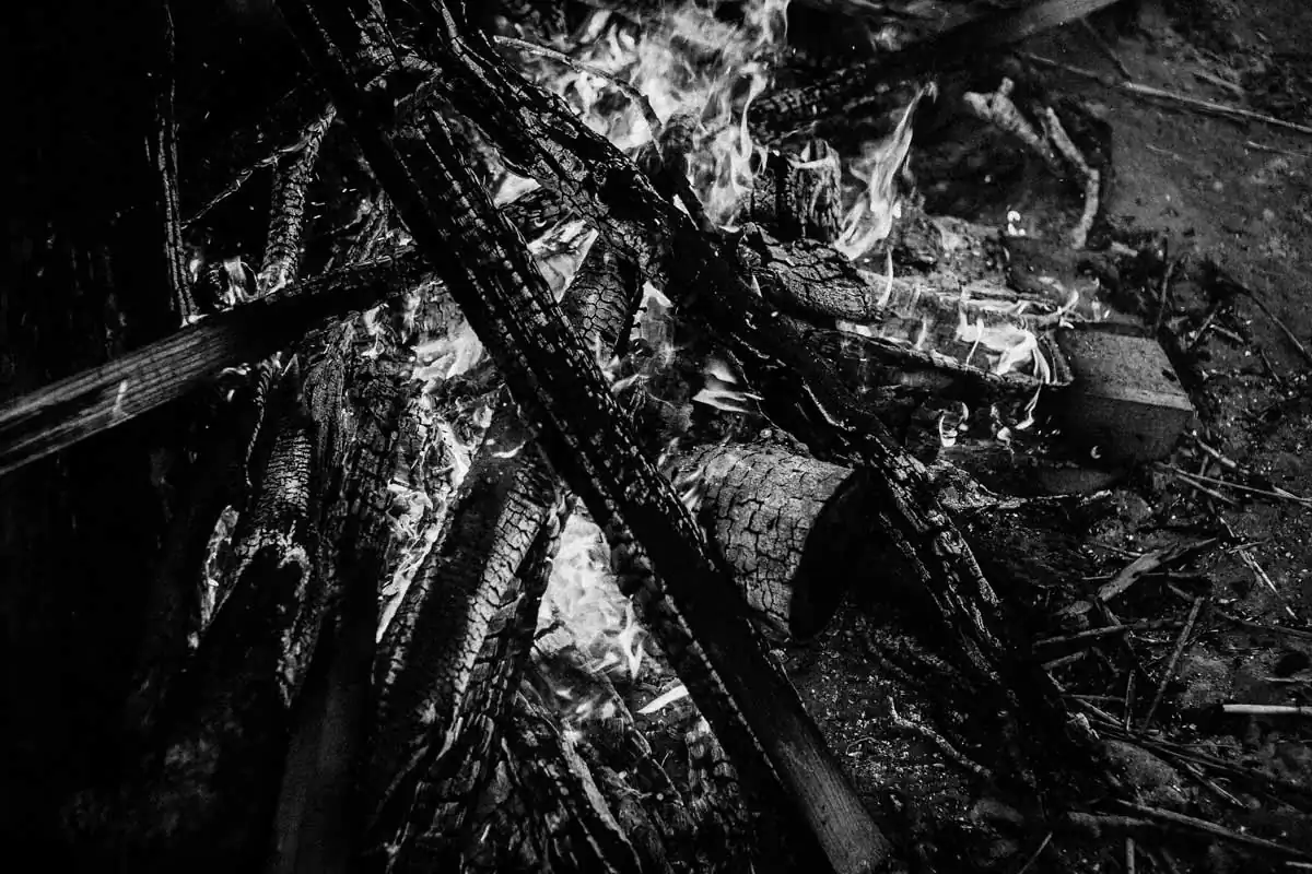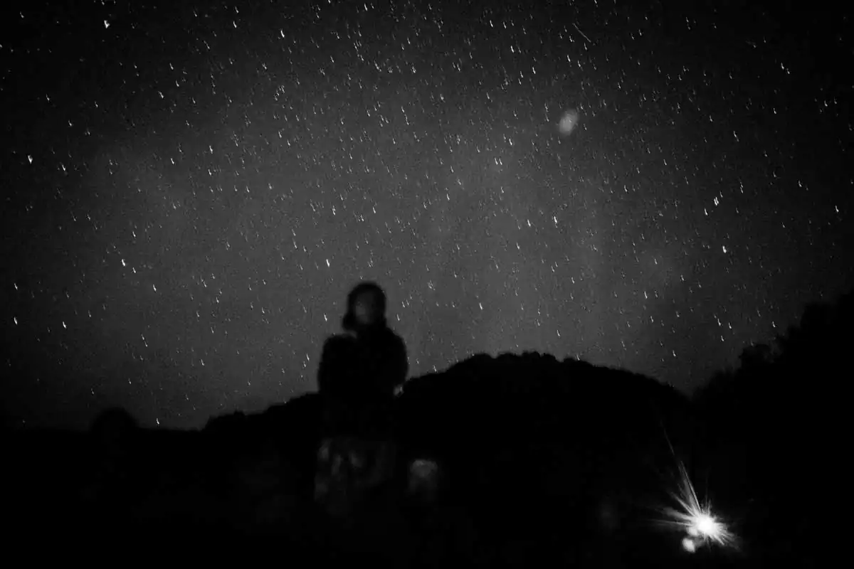 Star-filled sky over a bonfire in the mountains, sparks flying up to the glittering meteors.
