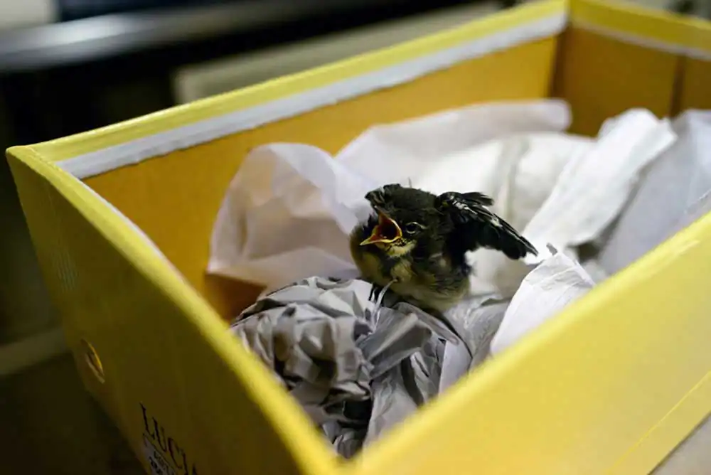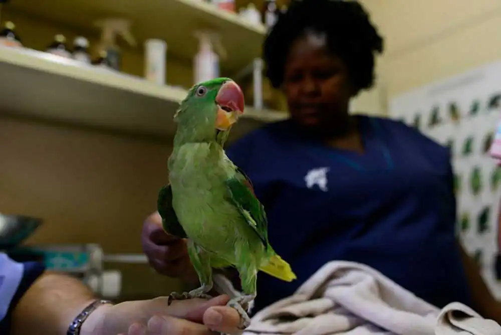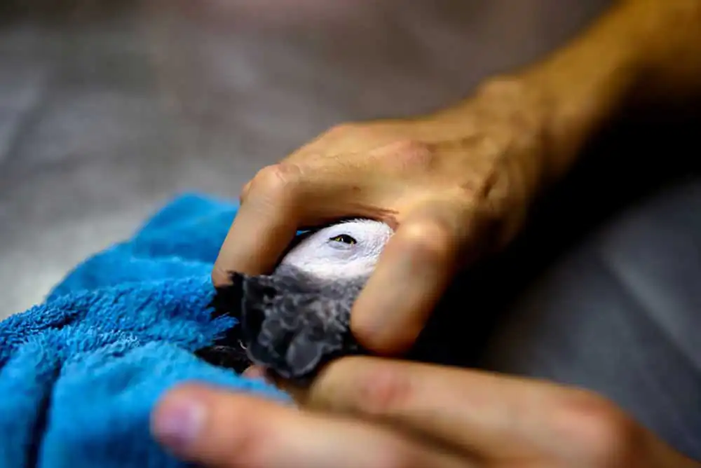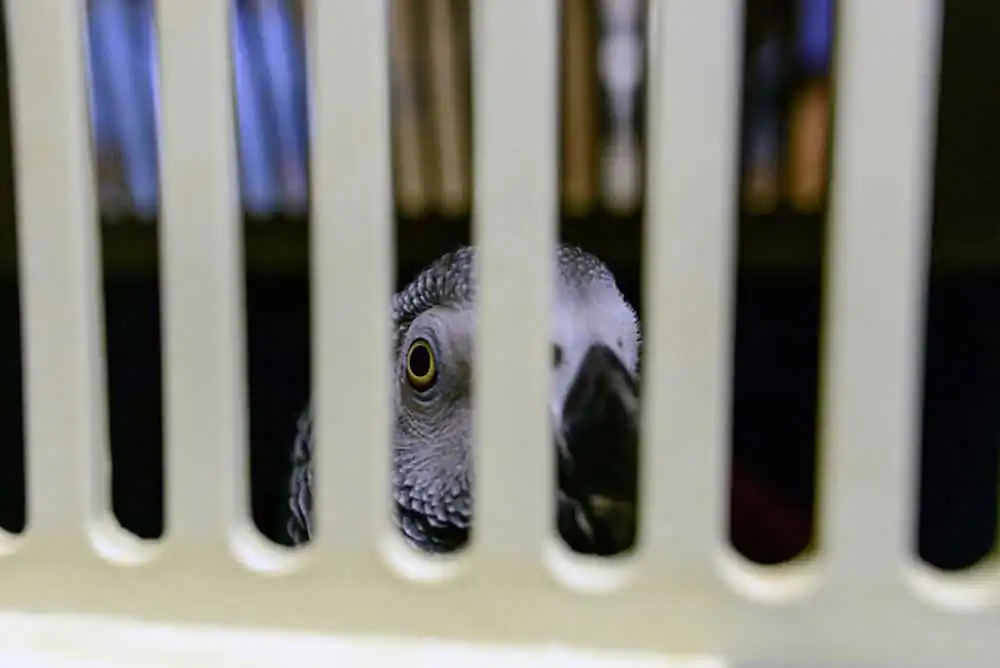 Charlie, the African Grey Timneh parrot, is waiting in his travel cage for his cataracts check-up. Cataracts is a common occurrence for African Greys. Therefore, Charlie’s owner annually schedules him in for a check-up