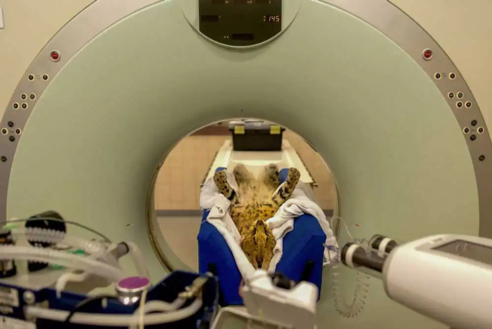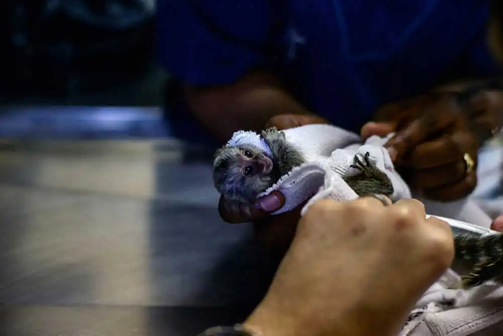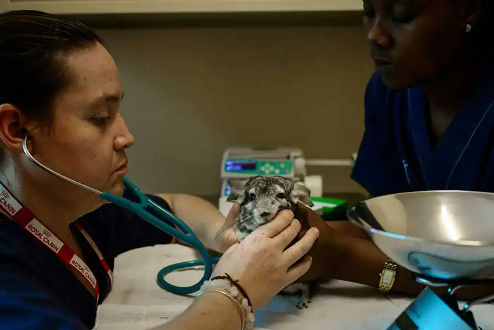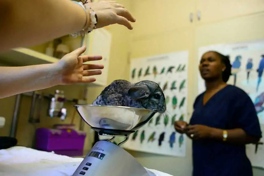 Veterinarian Dorian Elliot, of the Veterinarian Hospital for Exotic Animals at the University of Pretoria, and her assistant Meissie are examining a fatigued and listless chinchilla. The chinchilla is brought to the clinic by her concerned owner, who is afraid that something is seriously wrong with her pet’s health