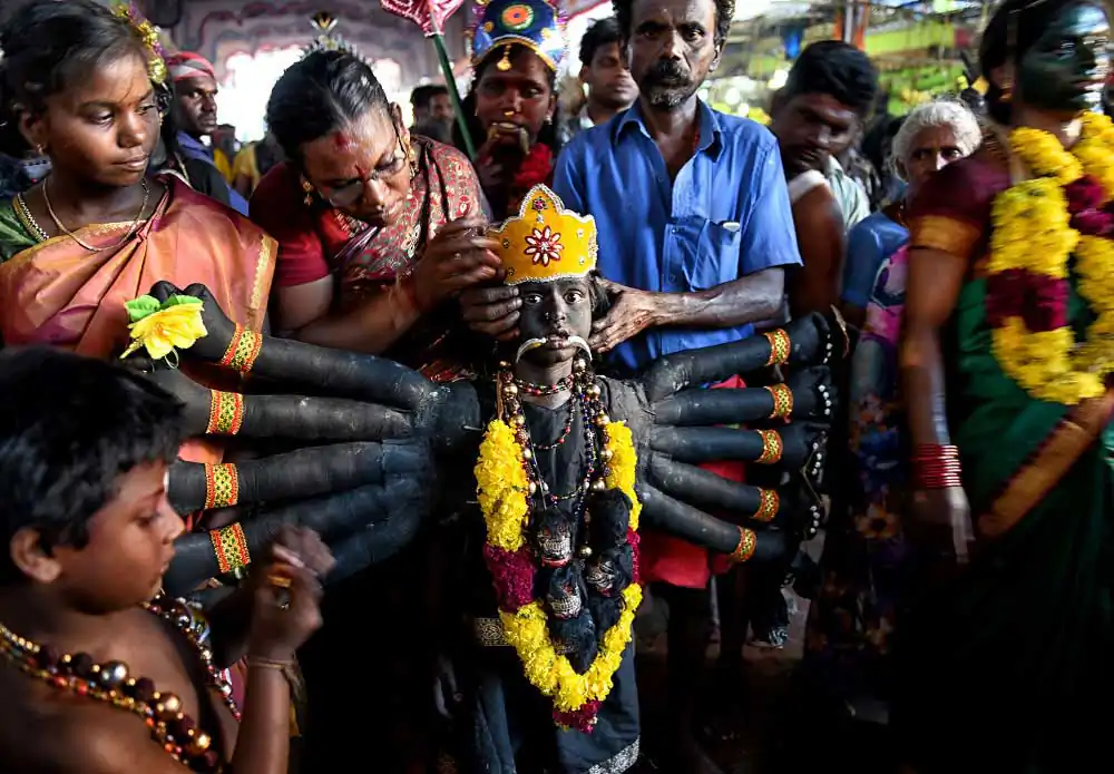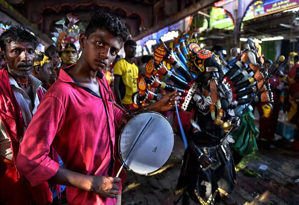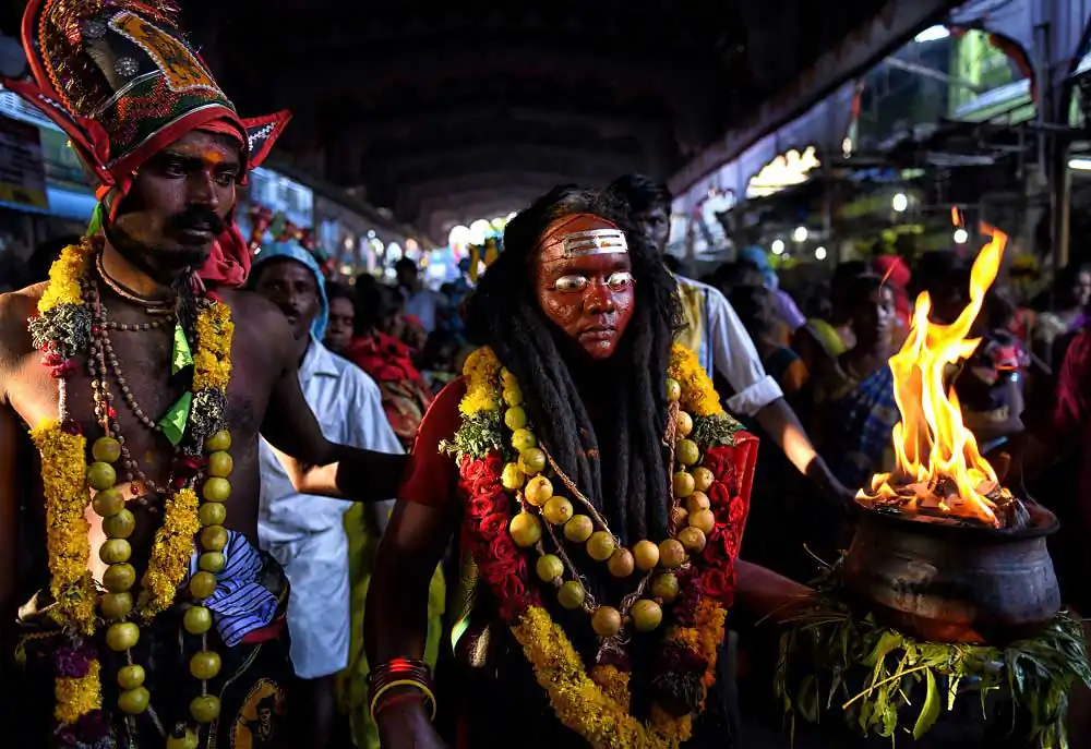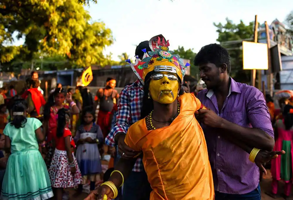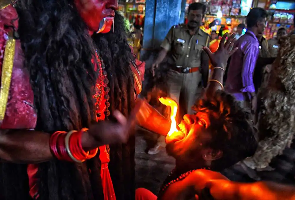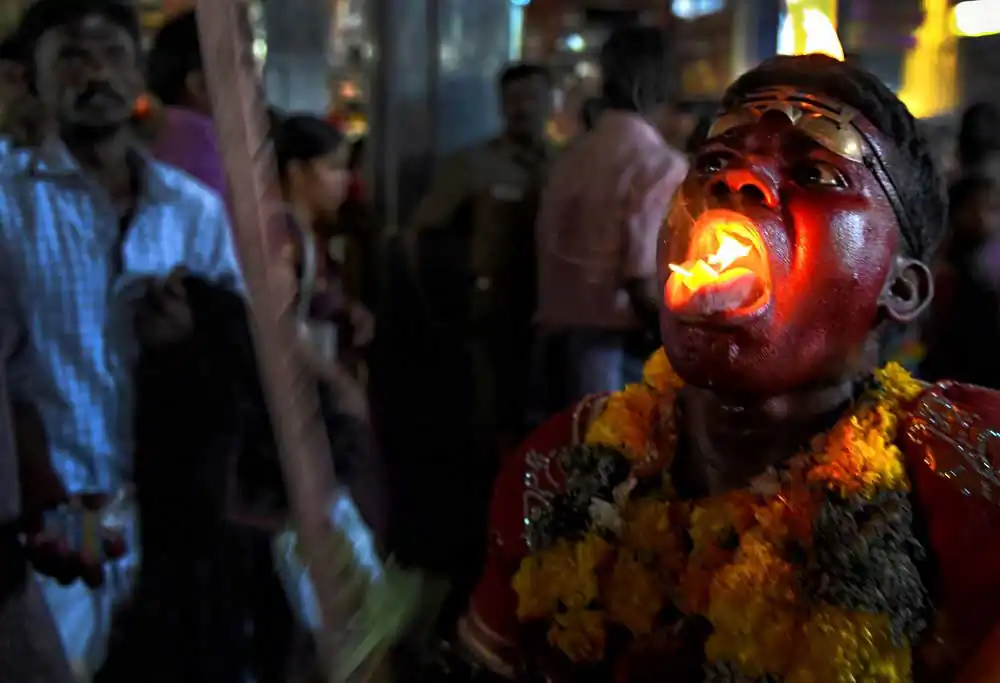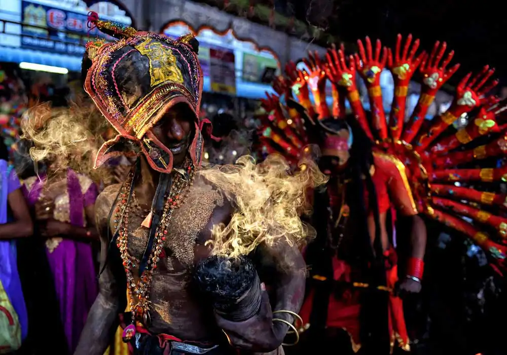 As per the tradition of this temple, devotees are inspired to transform themselves as Goddess Kali, kings, monkeys, beggars, and have to beg in the streets of the town. Their collected money is then submitted as an offering to Sri Mutharamman Goddess. Transformation to different looks are very much unique & powerful specially the looks of Goddess Kali as per Hindu Mythology. Devotees carry big fire pots on their hands as a part of the ritual, directly giving burning camphor on their heads & tongue during this Transformational Journey. Catching the moments of these powerful expressions towards their almighty are different from any other Dasara celebration of India and difficult to freeze the frame.