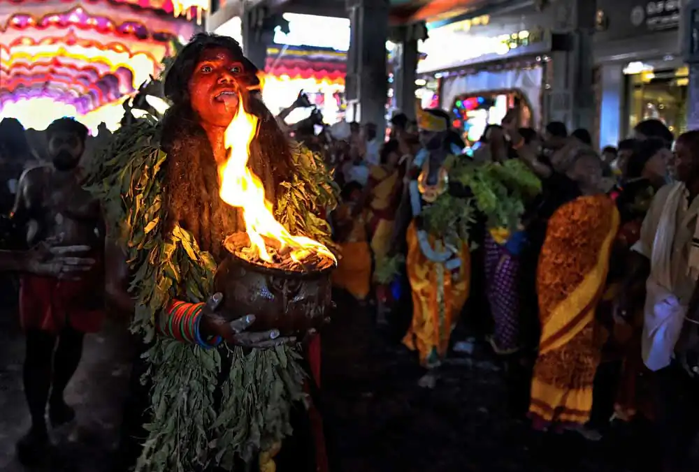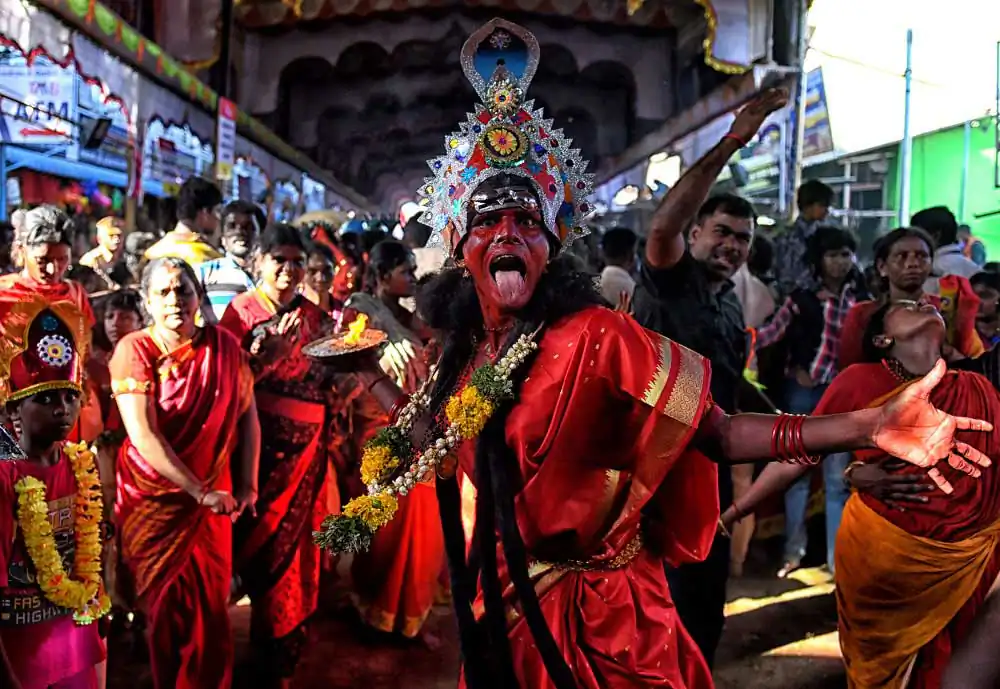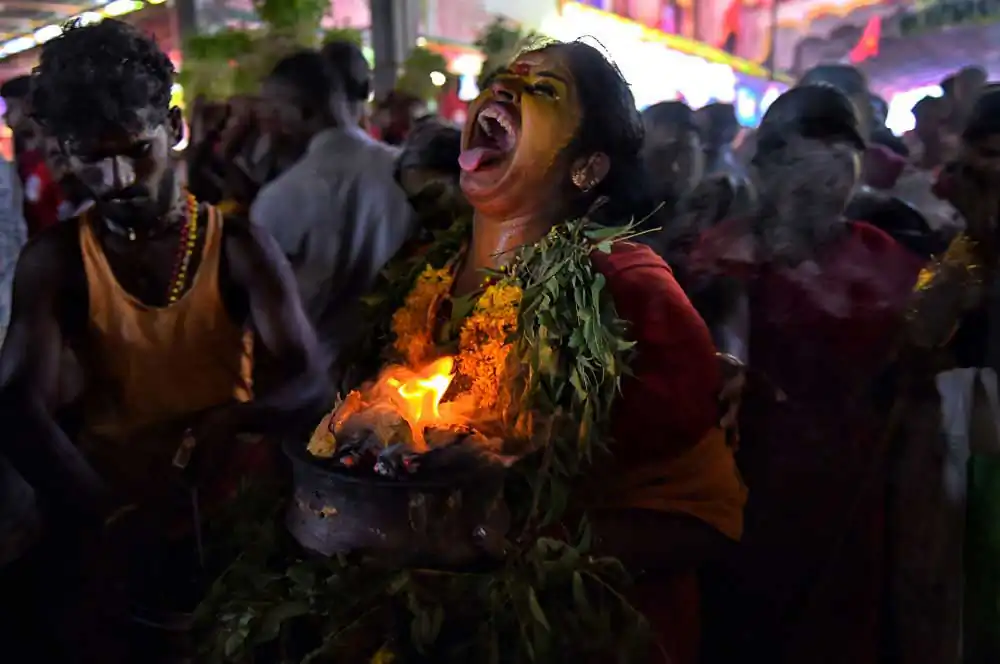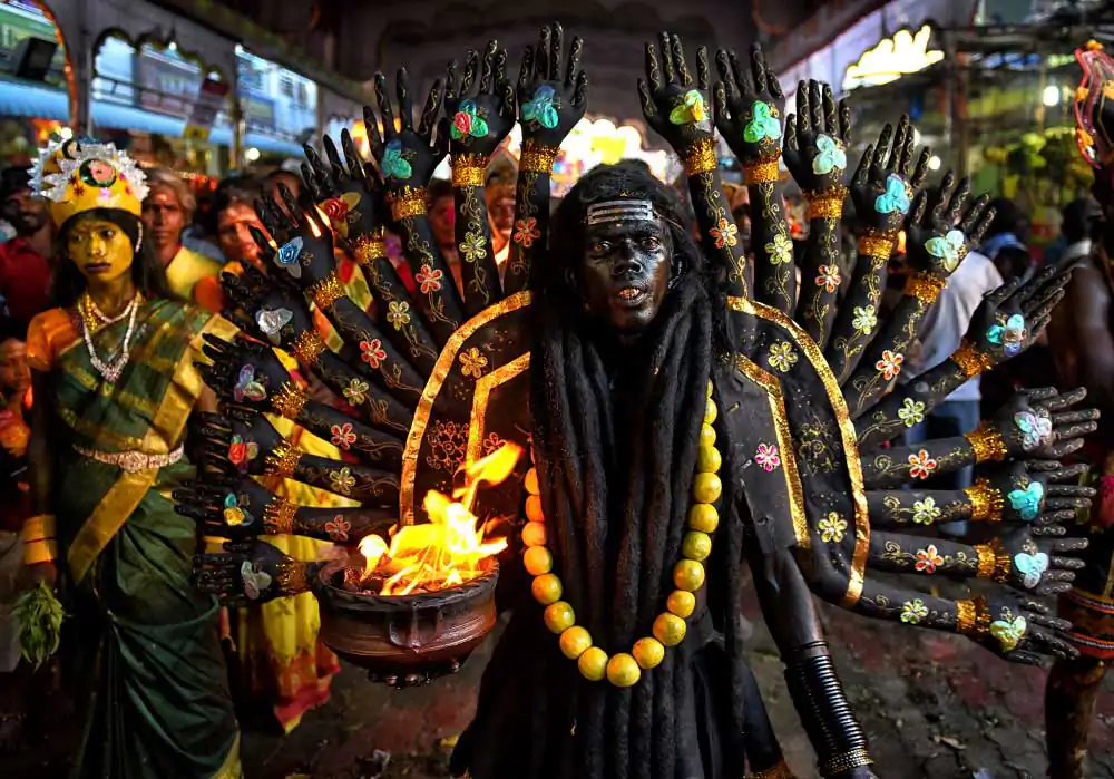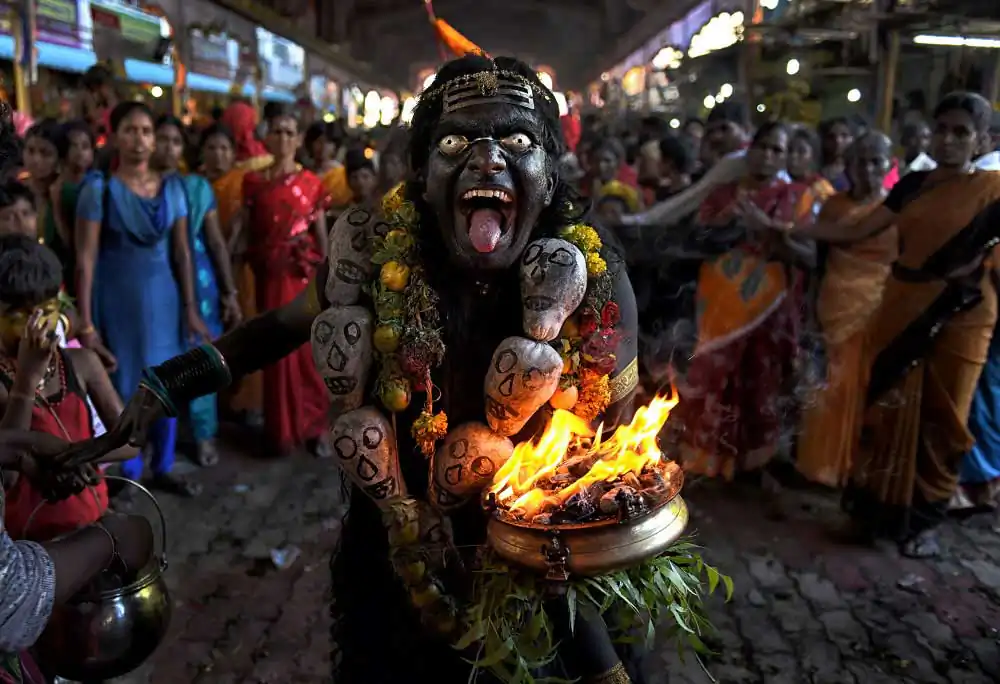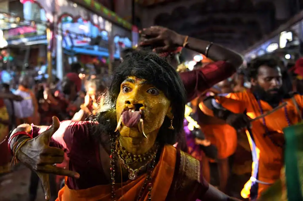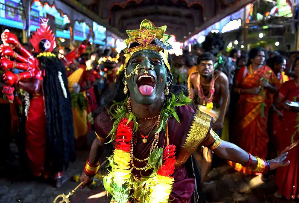 As per the tradition of this temple, devotees are inspired to transform themselves as Goddess Kali, kings, monkeys, beggars, and have to beg in the streets of the town. Their collected money is then submitted as an offering to Sri Mutharamman Goddess. Transformation to different looks are very much unique & powerful specially the looks of Goddess Kali as per Hindu Mythology. Devotees carry big fire pots on their hands as a part of the ritual, directly giving burning camphor on their heads & tongue during this Transformational Journey. Catching the moments of these powerful expressions towards their almighty are different from any other Dasara celebration of India and difficult to freeze the frame.
