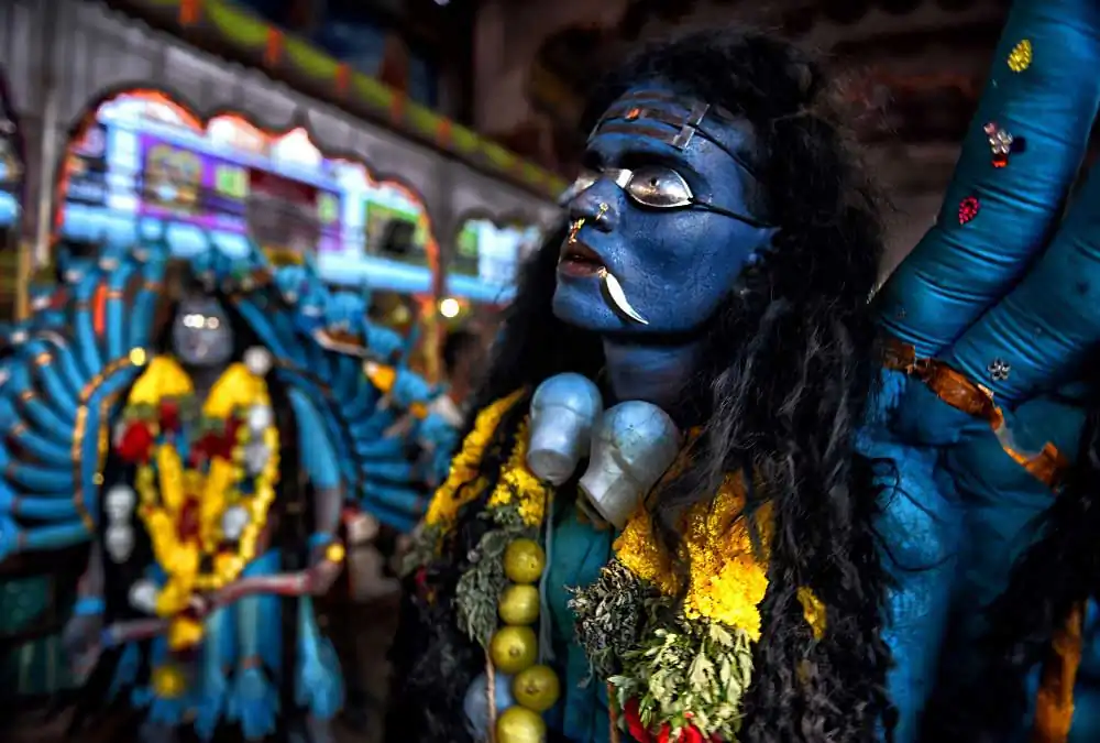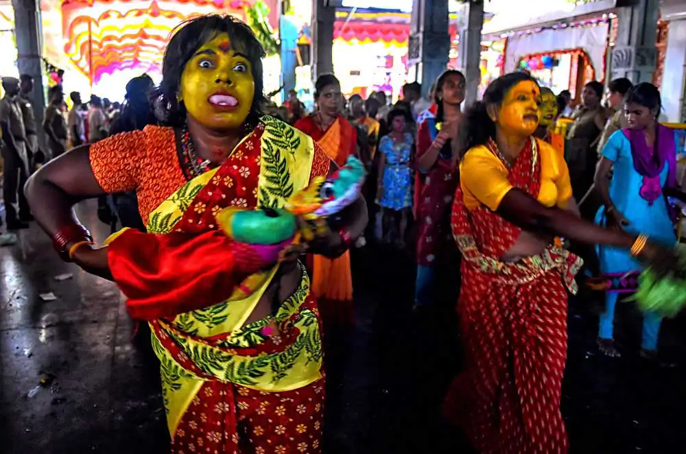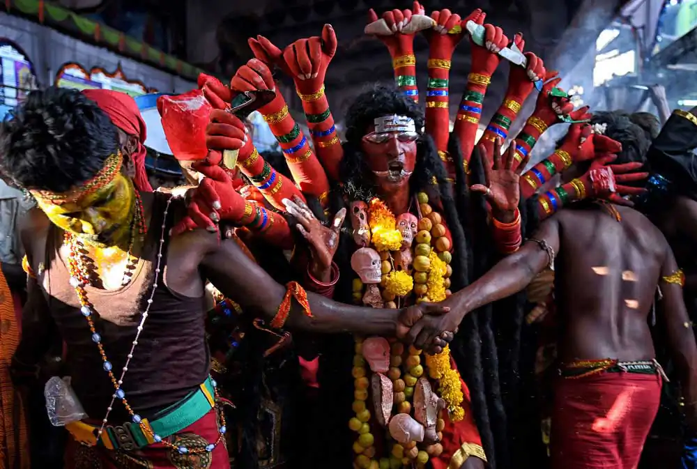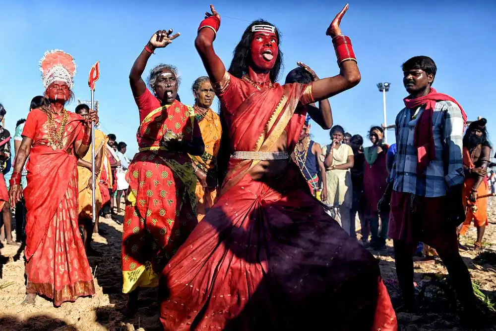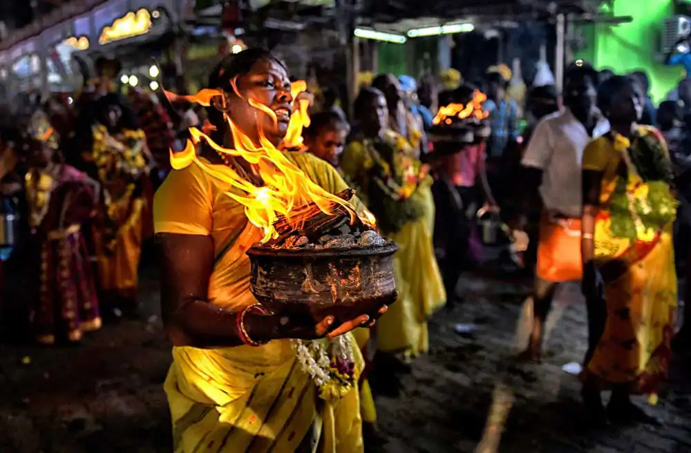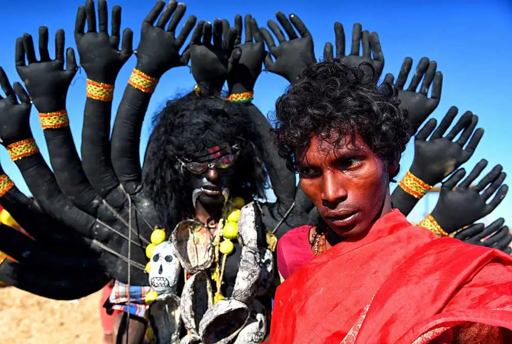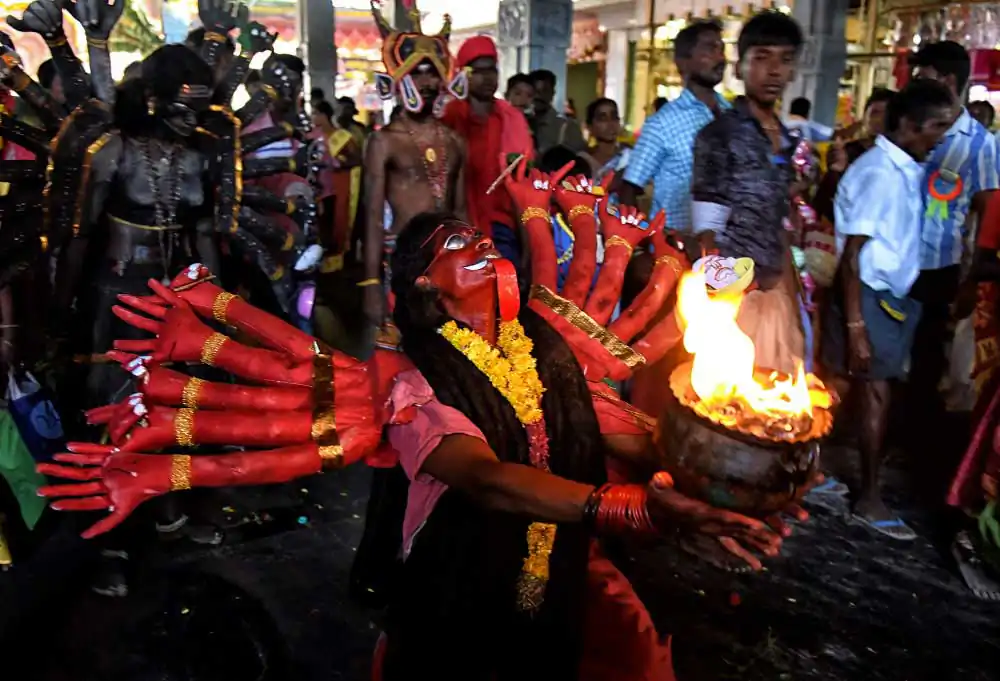 As per the tradition of this temple, devotees are inspired to transform themselves as Goddess Kali, kings, monkeys, beggars, and have to beg in the streets of the town. Their collected money is then submitted as an offering to Sri Mutharamman Goddess. Transformation to different looks are very much unique & powerful specially the looks of Goddess Kali as per Hindu Mythology. Devotees carry big fire pots on their hands as a part of the ritual, directly giving burning camphor on their heads & tongue during this Transformational Journey. Catching the moments of these powerful expressions towards their almighty are different from any other Dasara celebration of India and difficult to freeze the frame.