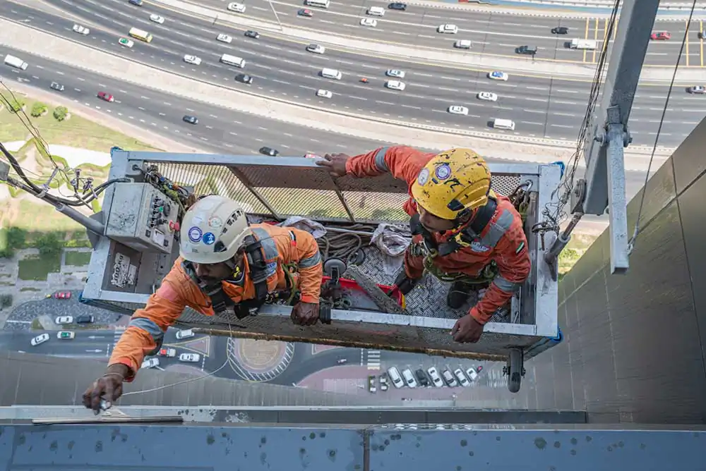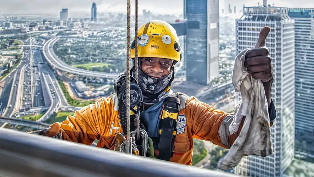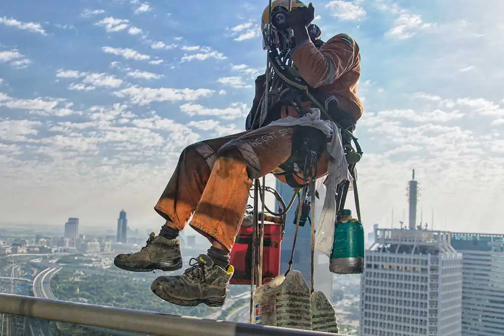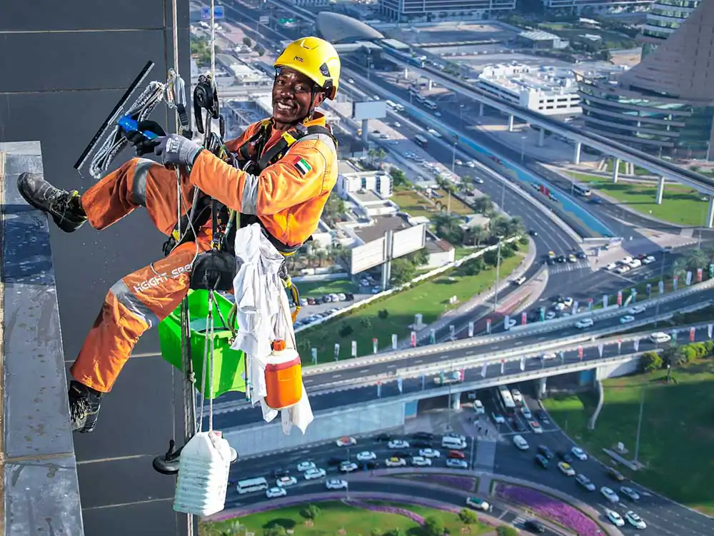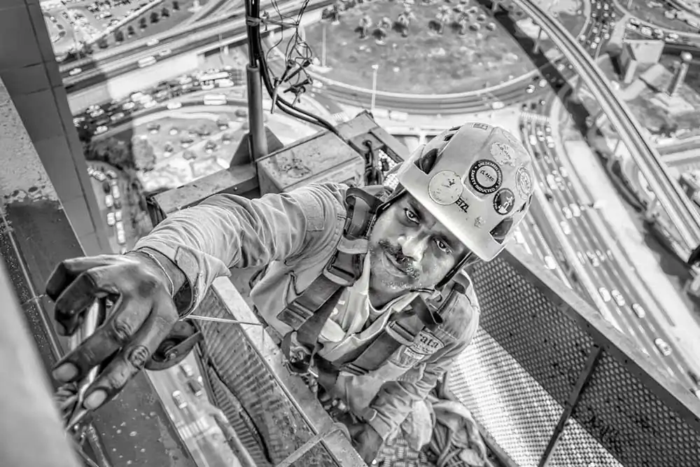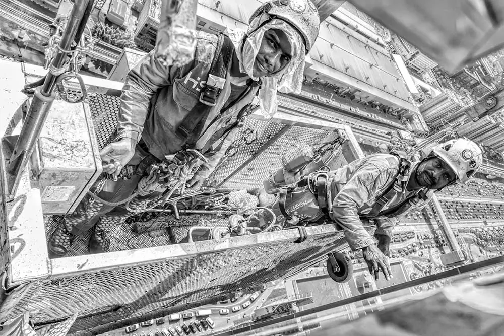 I think the facade glass cleaners have one of the hardest, heaviest and most dangerous jobs in the world  because they always have to work at a very high altitude and usually in hot and humid weather, risking their lives for a small amount of money, but for the love of their families.
