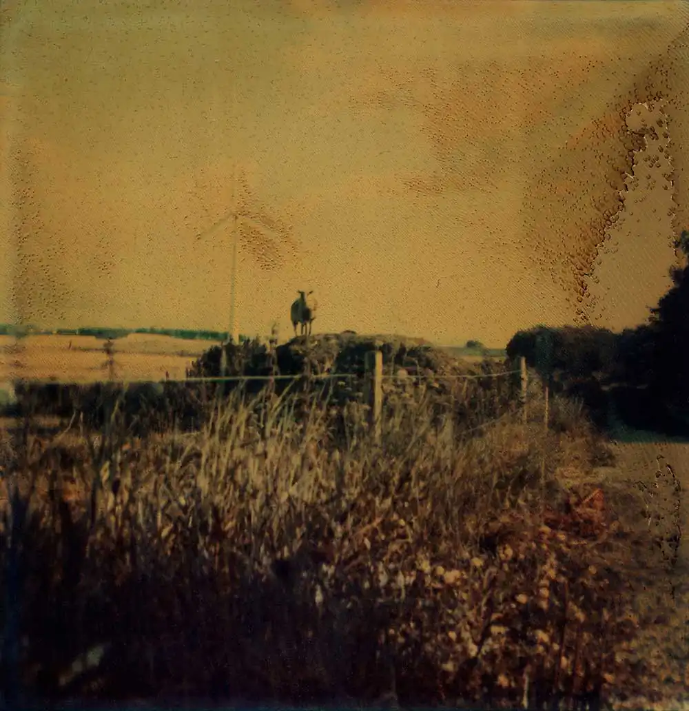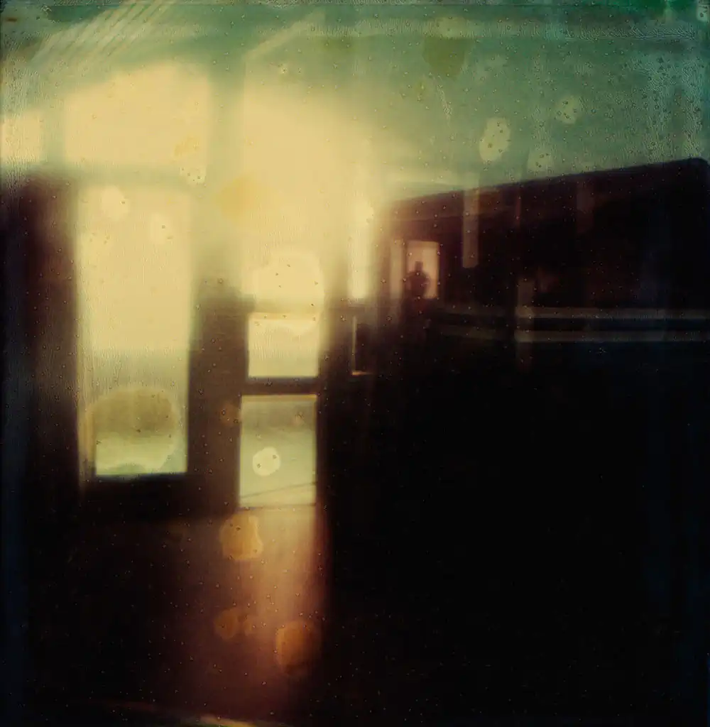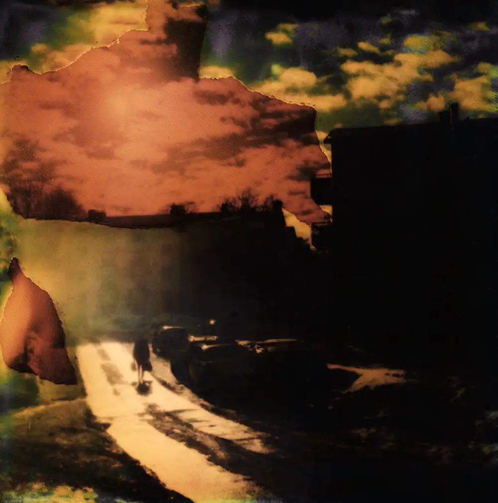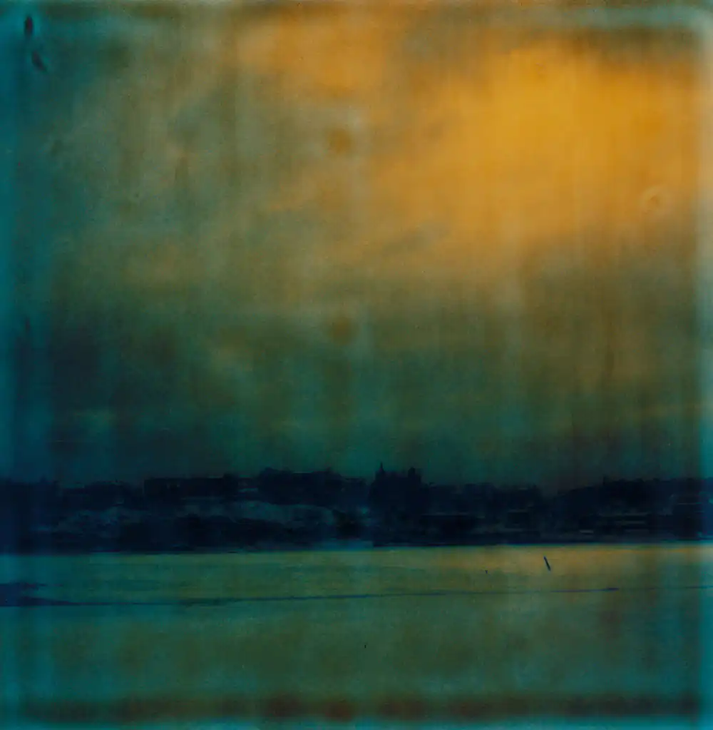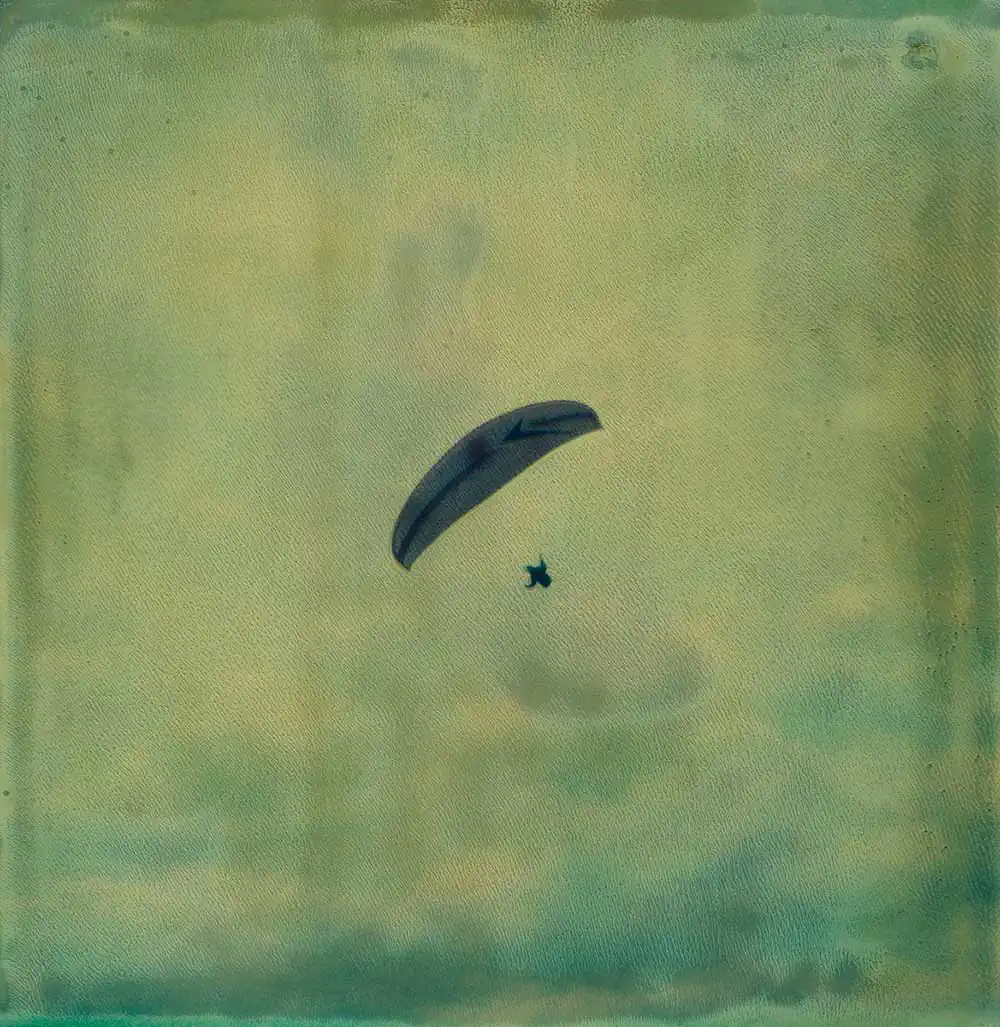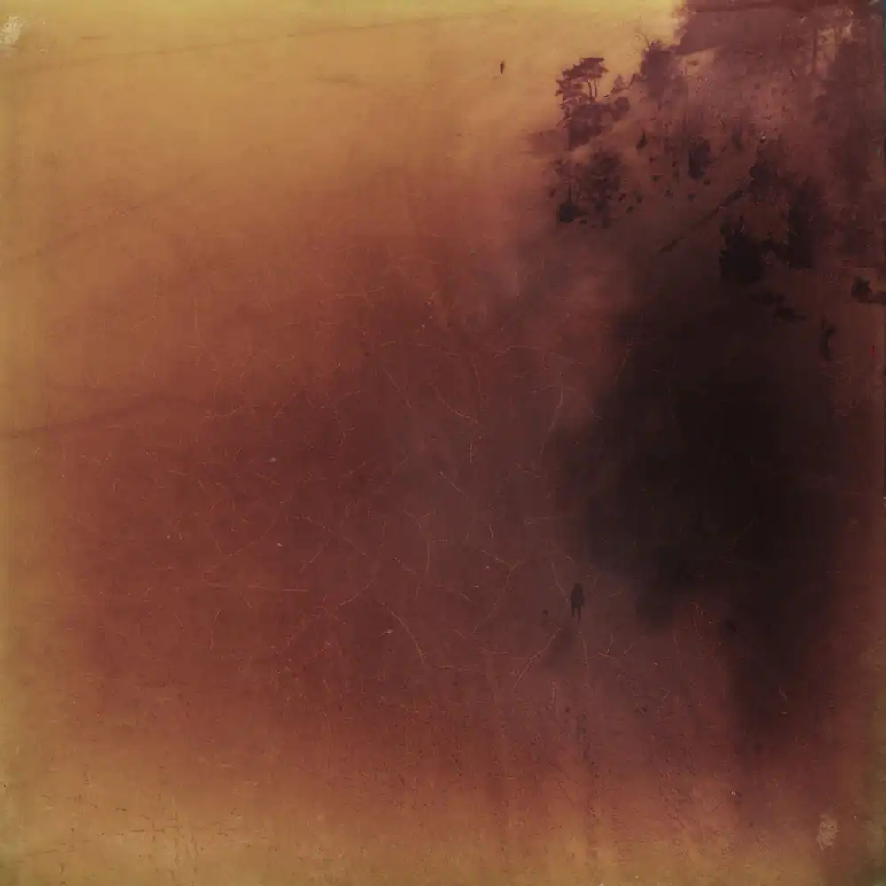 I see the small figures as a representation of life and time: the little person in the vast world. We are only on this earth for a short time, and I find beauty in that vulnerability. The images are photographed using a special Polaroid film that was manufactured by accident. If left untouched, the Polaroid images degrade and eventually fade entirely to black. When I take a shot, the chemistry gradually darkens the film, shifting in a gradient from blue-green tones to yellowish-brown over approximately 24 hours until the photograph turns black. I must stop the degradation by physically destroying the Polaroid essentially separating the layers of the film and halting the chemical process inside. The final expression can be influenced, but it is never entirely within my control.