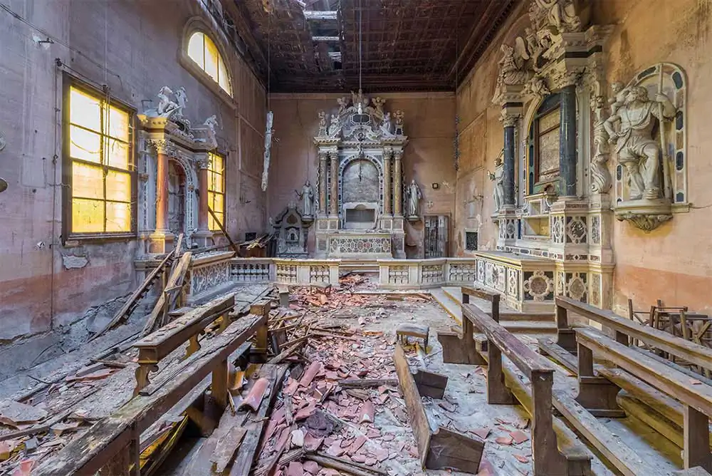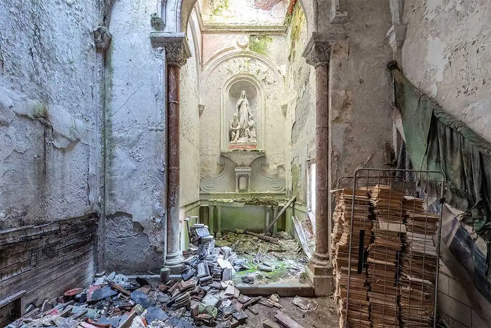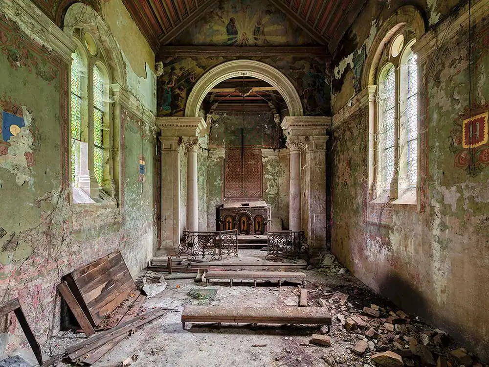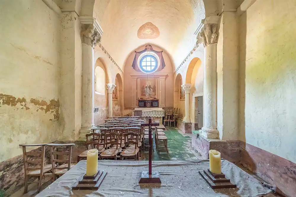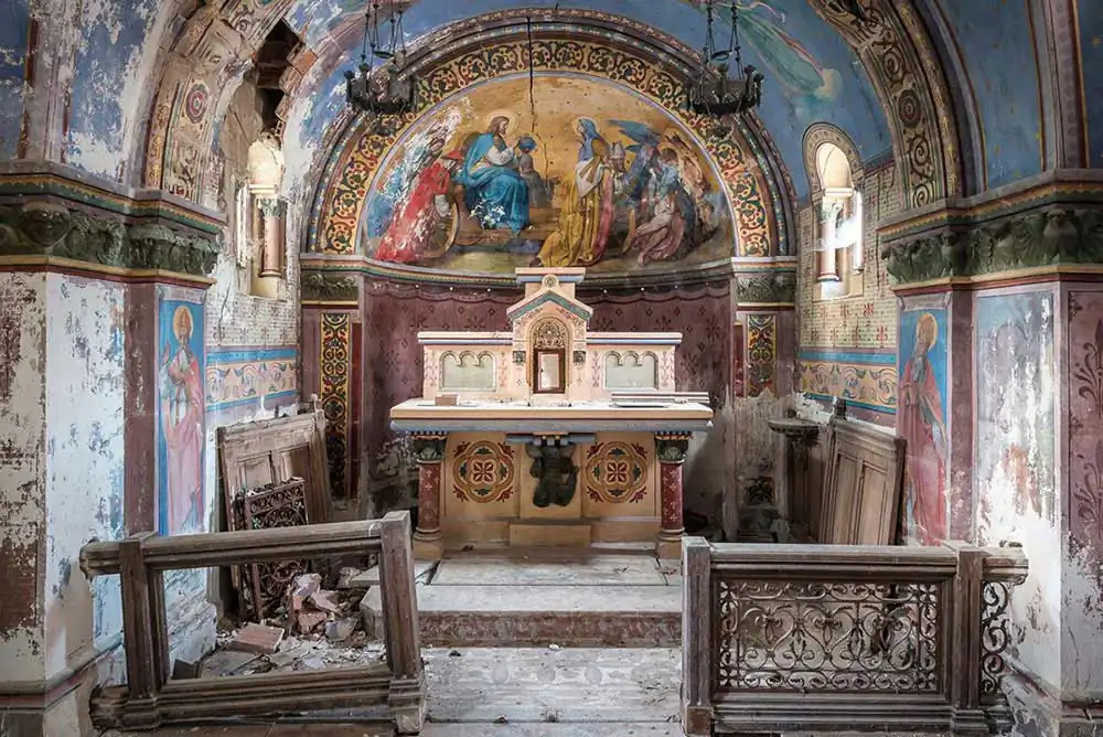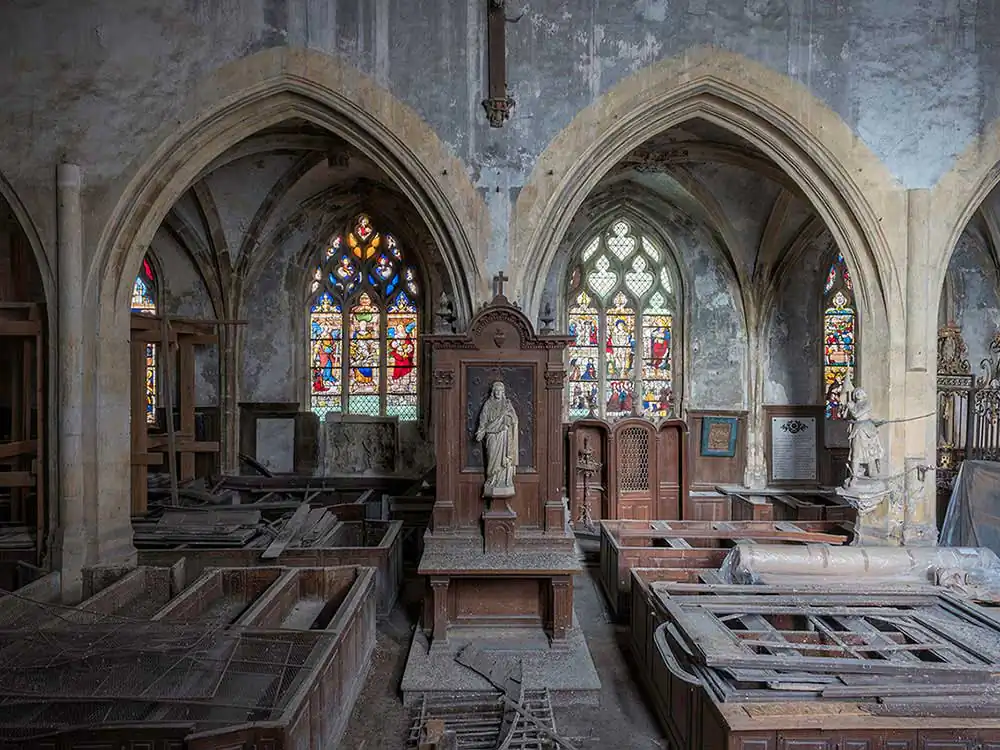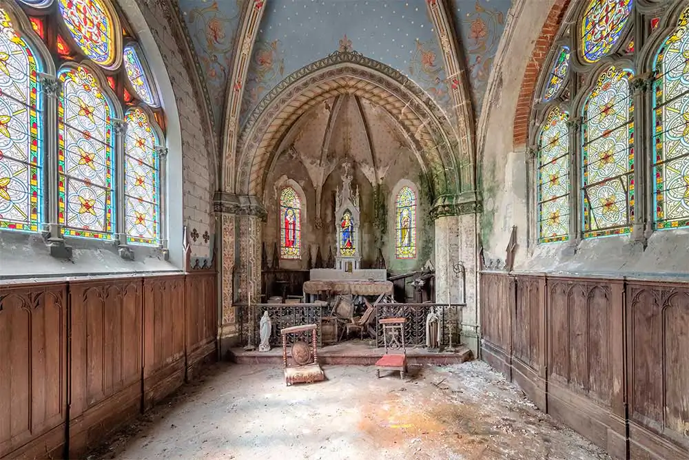 Once the service was over, we used to sneak off without a word to escape a second, rather less amusing sermon. I also have a memory of the 30 cts my mother used to give me for the collection which stayed in my pocket every Sunday to save up for the 3.50 Francs to buy a toy “Matchbox” car at the local tobacconists’ on the road to the house. It makes me sad but also gives me a wry smile that over the years I regularly measured my faith by admiring the little collection of cars I built up over the years. Enough to fill the entire drawer of a chest of drawers. Today it is with a free spirit and without any constraints that I enter by the door or window of an abandoned church to admire the light and take some pictures. I sometimes feel guilty but only when I think to myself that I probably was not the only child to keep the collection money to buy a toy given the state the church is in now. [Official Website]