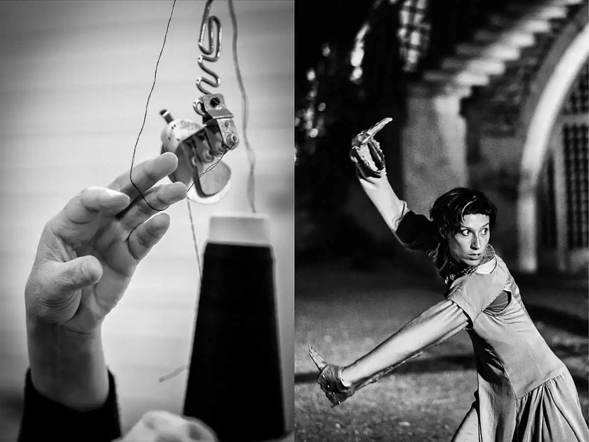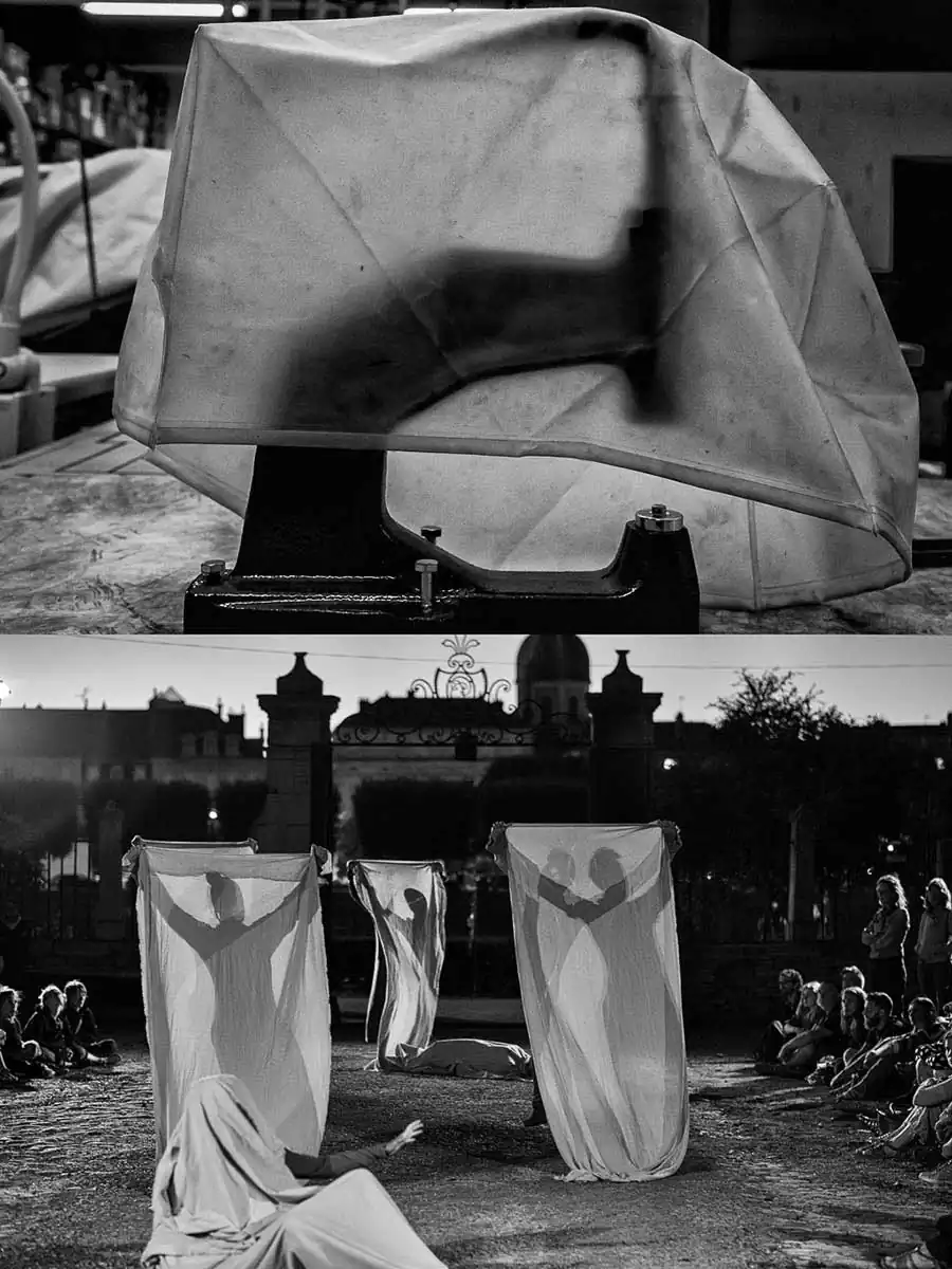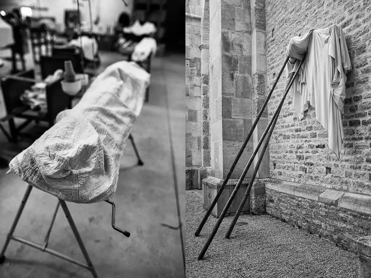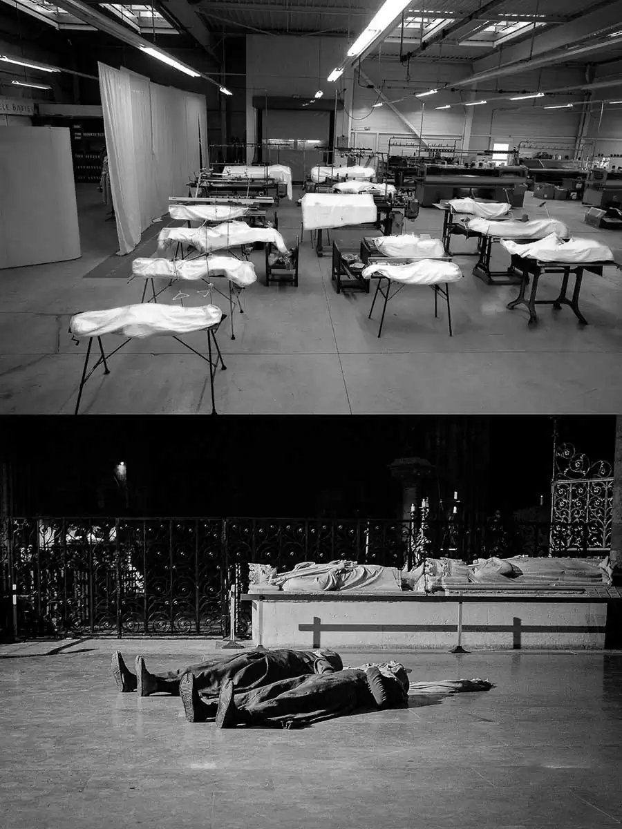 It is the close history of two “falls” and their recovery, on the one hand the World Tricot company and on the other the contemporary dance show of Nathalie PERNETTE where recumbent people find life and emotions and sensations at contact with living humans … It seemed to me that the best way to present these similarities was to make diptychs. We will therefore appreciate the virtual links between these images, based on the similarities that unfold in different forms: graphic themes, recurring patterns, gestural or other echoes, analogical relations, associations of ideas, symbolic … as for example this first image of the World Tricot workshop that I was able to realize during the first visit, at a time when the activity was at a standstill, with this view of the machines aligned, covered with a protective white sheet, such shrouds, having made me think of death of course … closer to the spectacle of Nathalie PERNETTE which begins with a scene where the sleeping people wake up from their frozen eternity (Diptyque No. 1), then walk around finding emotions, and sensations, to end up sharing them with the living in a great momentum of humanity (Diptych n ° 15) … The series was formed in the aftermath without initial intention, laquell e might have a little too formatted shots … Meaning can emerge in everyone by the projection of his own references, values, developing the attention that will allow the discovery of these links and the pleasure that is linked to this aesthetic experience … Because as Roger DADOUN says “the image always shows more, it is overexposing” – like the needles, which come there, as to recall the fate thrown to this atypical company, and the “Ghosts” that rode in the show of Nathalie PERNETTE … (Diptych n ° 2). Thus, these fifteen diptychs present themselves in a form of hybrid photographic work that combines images from fields such as reportage, documentary, artistic, etc. to constitute a polyphonic object, with an aesthetic aim … where the meaning is built by the play between the elements and the receptivity and the projections proper to the spectator …