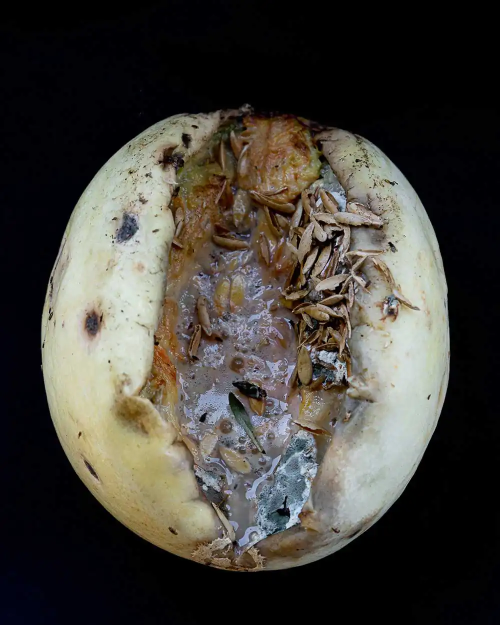 At first glance images of rotten fruit allude to themes of food waste, and by proxy, food inequality, the environment and global hunger. There are so many things wrong with our broken food system that I’m constantly considering the repercussions of my own food choices.  The result of this practice:  I can’t help but document the produce that I’ve wasted —  misshapen, moldy, or disfigured —  like a catalog of failures, or a confession of my sins.