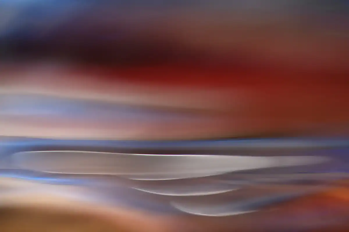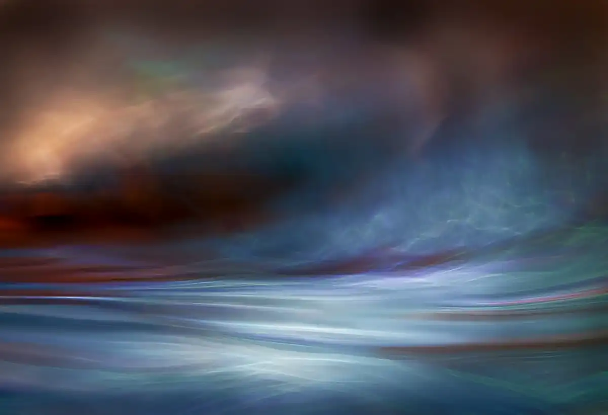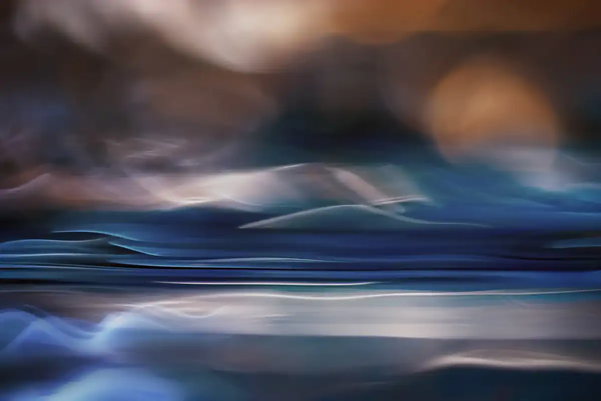 My aim in the Fantastic Landscapes project is to make pictures that are abstract impressions of landscapes or seascapes, in particular those of the Pacific Northwest, where I live. Rather than reproduce the actual scene, what I attempt to do is to show the essence of a place. There is much more to a place, to a picture, than just what you see with your eyes. There are the thoughts at the time, the sounds, the smells, what you touch … and more. All these are real. I try to make them integral to my photography. The pictures in this series are either single studio shots, or a blending of studio and outdoor (landscape or seascape) shots. All images used are my own. The studio shots are closeups of reflections in a pan of water. Imagine being by a calm lake in Autumn, sun behind you shining on the beautiful trees at the other side of the lake. What do you see on the surface of the lake? A beautiful reflection of the Autumn colours.