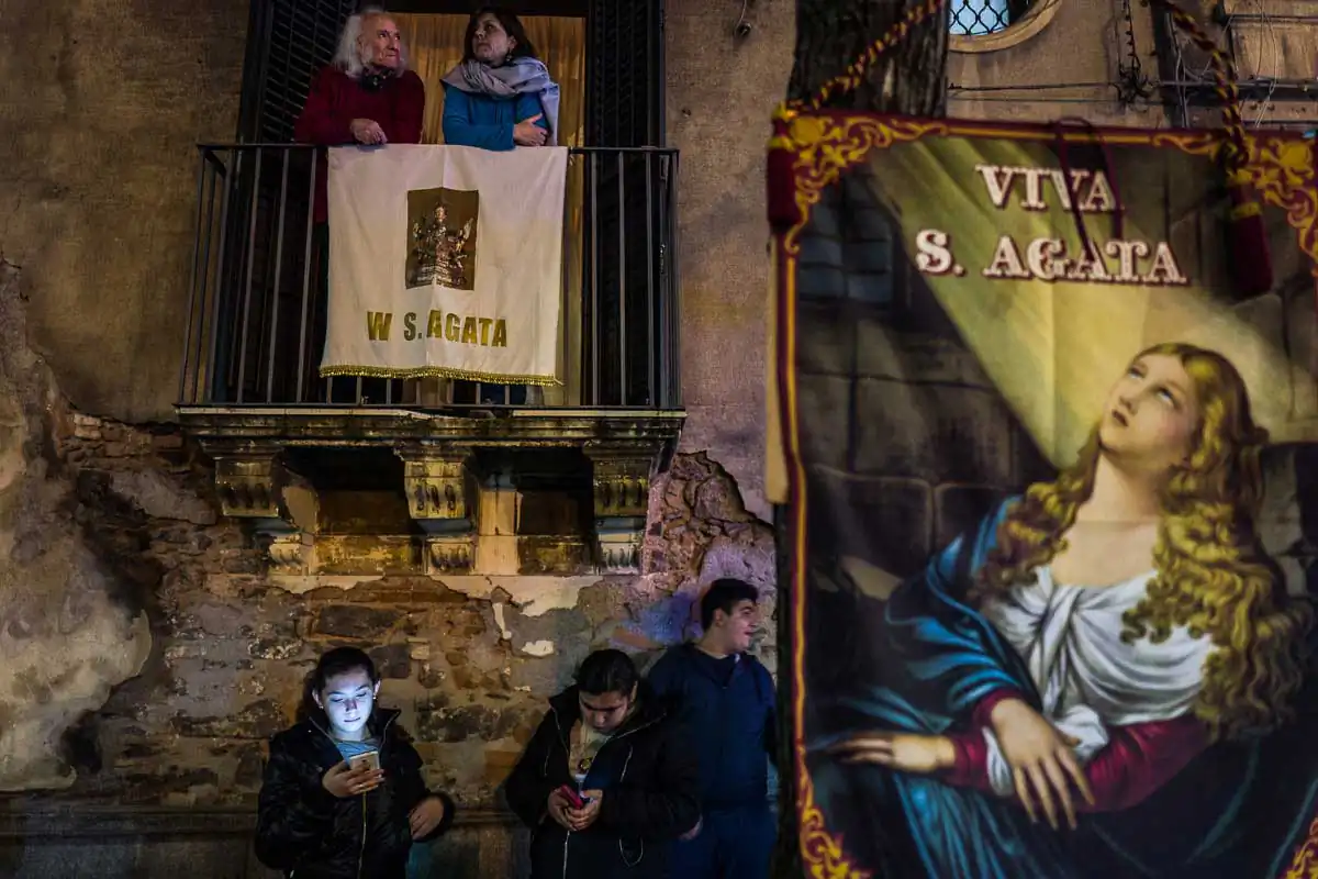 Every year from 3rd to 6th February, more than a million faithfuls arrive in Catania to attend the processions and prayer that take place around the clock. The young Agata was part of the Christian minority who lived in Sicily during the 3rd century. The Roman governor wanted her for himself, but Agata refused. She was persecuted and martyred by cutting of her breast until she was put to death on February 5th. According to some chronicles after an eruption of the Enta volcano in the 12th century the lava flow stopped just at the church where the faithful were in prayer for the celebration of the martyrdom of St.Agata. This photo series portrays the attendees and observers of this festival during the day and night.