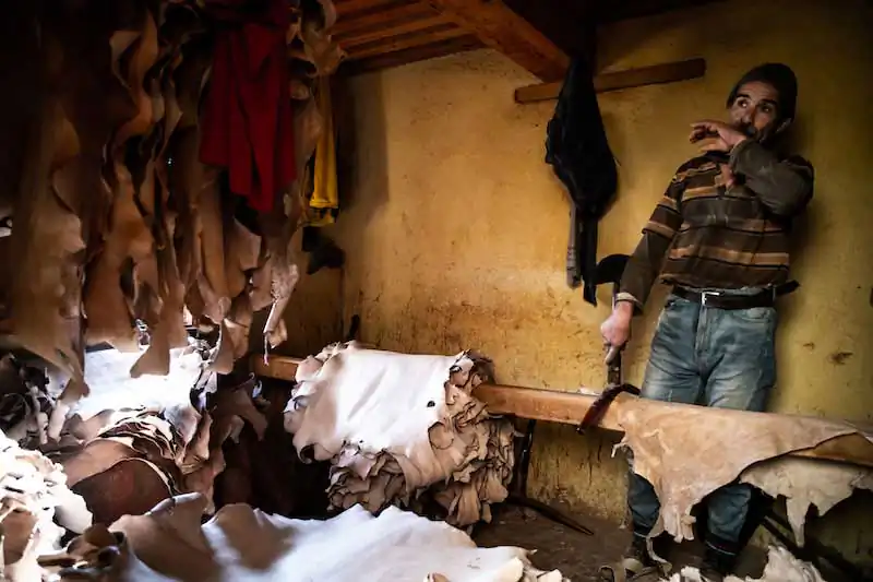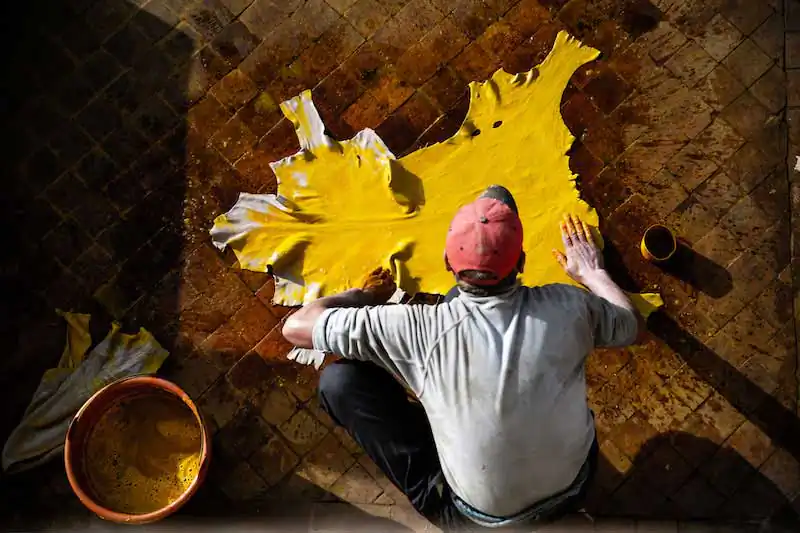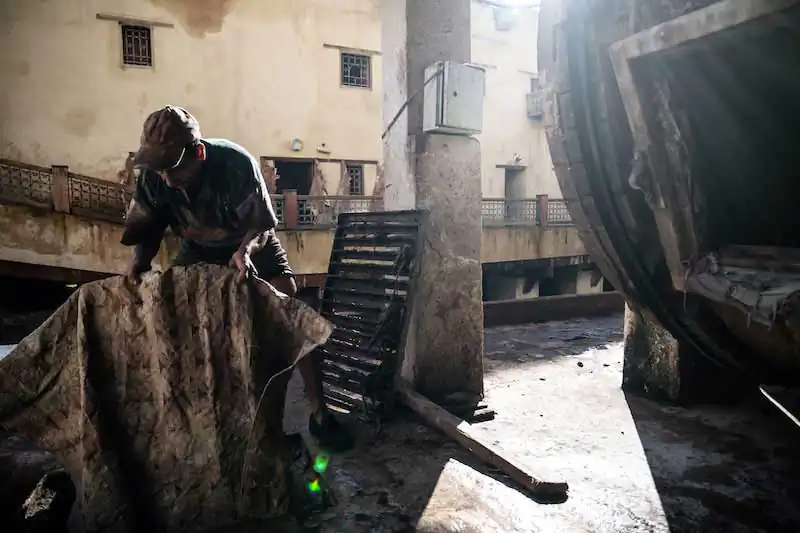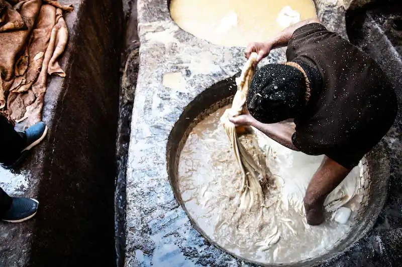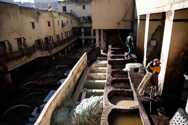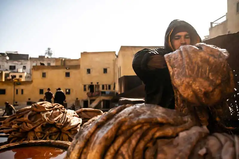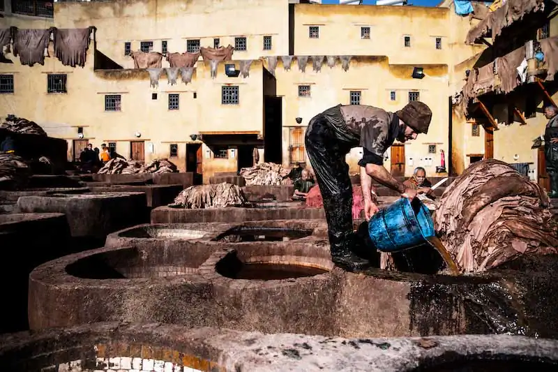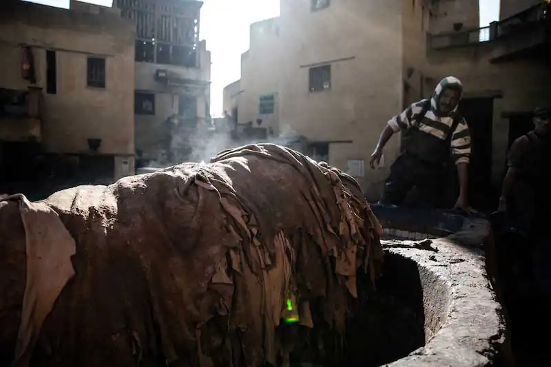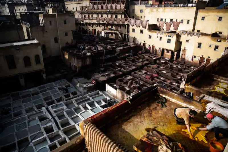 Fez’s social and economic life revolves around the bazaar and the leather trade, dealt with in the 4 large tanneries that open up like glimpses in various parts of the city, and which impregnate the Fez air with the scent of the treated skin.