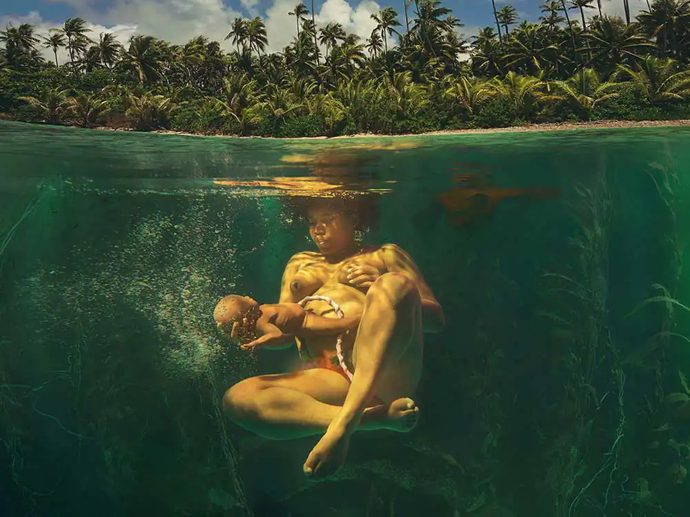Spotlighting women of history from the Virgin Mary to the Queen, the series is partly inspired by the artist’s own experiences of birth. In ‘The Creation of Man’ the Virgin Mary is crowning Christ, a vision that has eluded Nativity artists and may be the first photographic interpretation. ‘Aquadural’ pictures a primitive woman, giving birth in the ocean alone, honouring the history of waterbirth known from 2700BC.