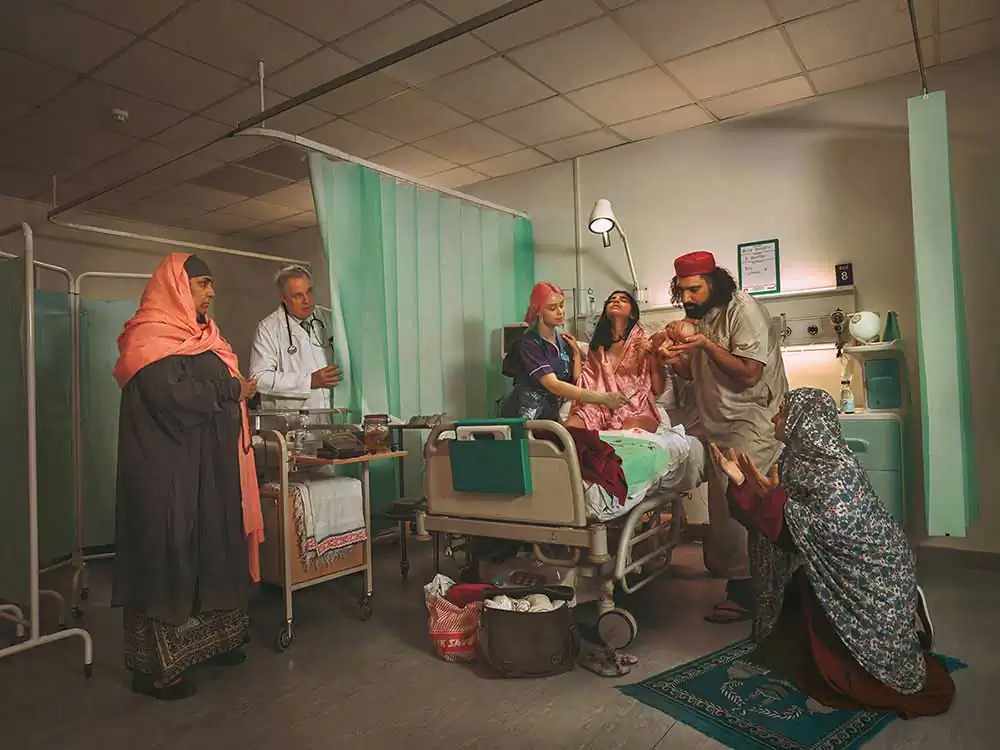 ‘Royal Blood’ portrays the last Royal homebirth of Queen Elizabeth II in 1964 to Prince Edward in Buckingham Palace, to convey that the Queen broke several traditions including birthing unobserved. ‘Call to Prayer’ recreates a Pakistani Muslim family birthing in a hospital in modern 1990s Northern England, whilst ‘Born of Calamity’ shows Calamity Jane birthing in mid-19th century in a Wild West town.