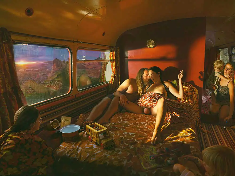 In ‘Salle Sauvage’, a glass Cube set in a garden becomes a metaphor for Michel Odent’s French term (meaning ‘primitive room’), to depict a woman birthing amongst nature in a museum-like spectacle. ‘Power Pilgrimage’ takes another birthing figurehead, Ina May Gaskin, to show the first birthing woman present on their ‘Caravan’ escapade travelling from California to Tennessee in 1971, which spearheaded their infamous Farm community.