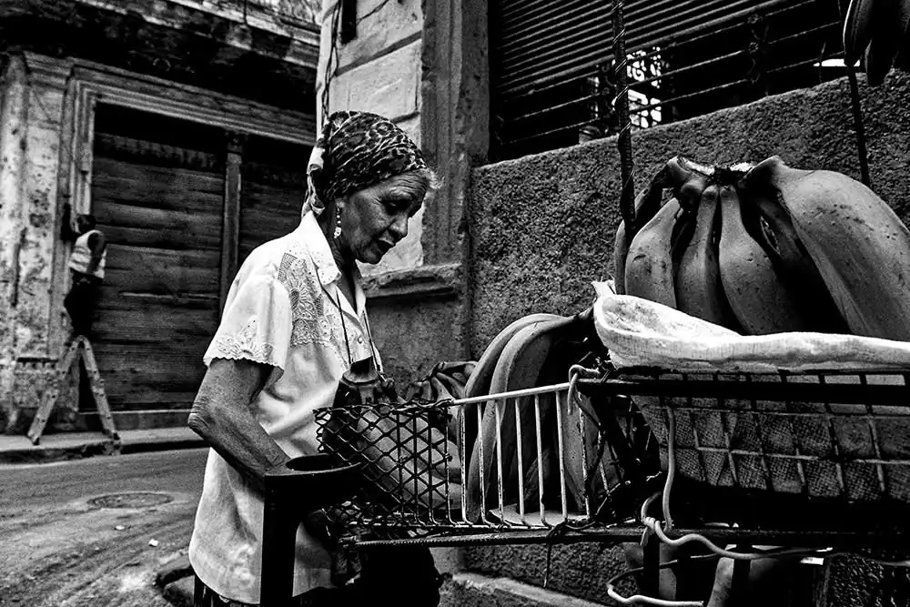 Gaelle Guse’s photographs begin with sensory immersion. Her first encounter with Cuba is marked by weather, texture, and movement: rain on streets, barefoot walking, shared shelter. The camera follows that initial openness. While vintage cars and musicians appear, they do so as part of a broader visual field rather than as isolated motifs. Guse’s work acknowledges Cuba’s photogenic intensity without collapsing into cliché. The island appears as a place that invites looking, where color and light do not perform for the camera but coexist with it.