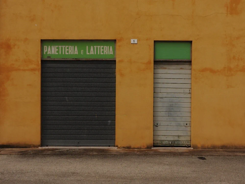 The series continues indoors, through doors and floors, where the space itself becomes the protagonist. No narrative is imposed; what is shown is simply the environment. Function is suggested but inactive, as in the bakery and dairy images, which confirm activity without showing it. These structural images occupy the center of the sequence, providing rhythm and solidity to the project.