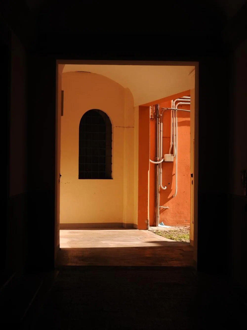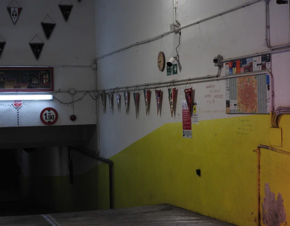 More intimate interiors, such as the yellow bar, and transitional spaces like an underground ramp, introduce variations of scale and orientation. The visual language remains sober and measured: the viewer’s gaze stabilizes, focusing on forms, boundaries, and surfaces of the environments.