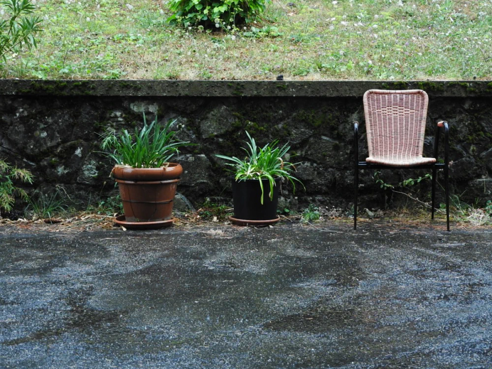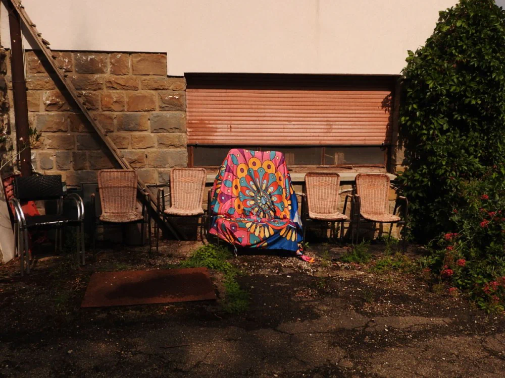 Exteriors with objects ready for use, like pots and chairs on asphalt, evoke human presence without storytelling. Chairs with colored covers introduce a subtle dissonance: color enters but remains controlled, adding tension without breaking the unity of the sequence.