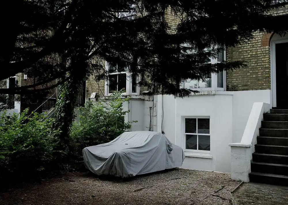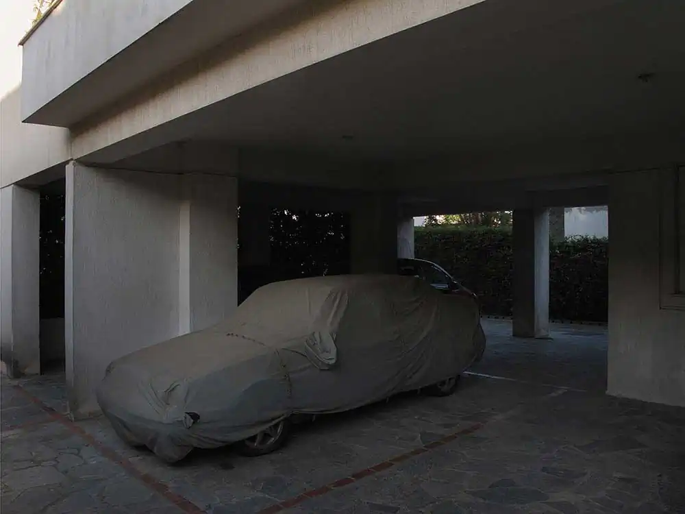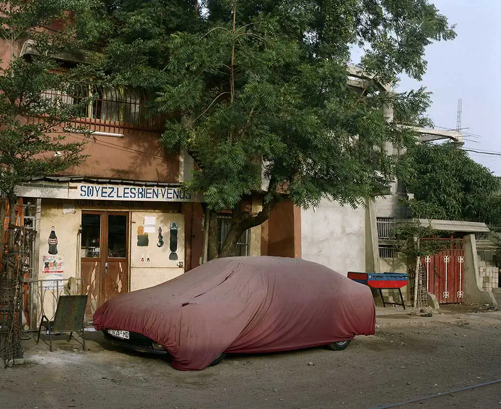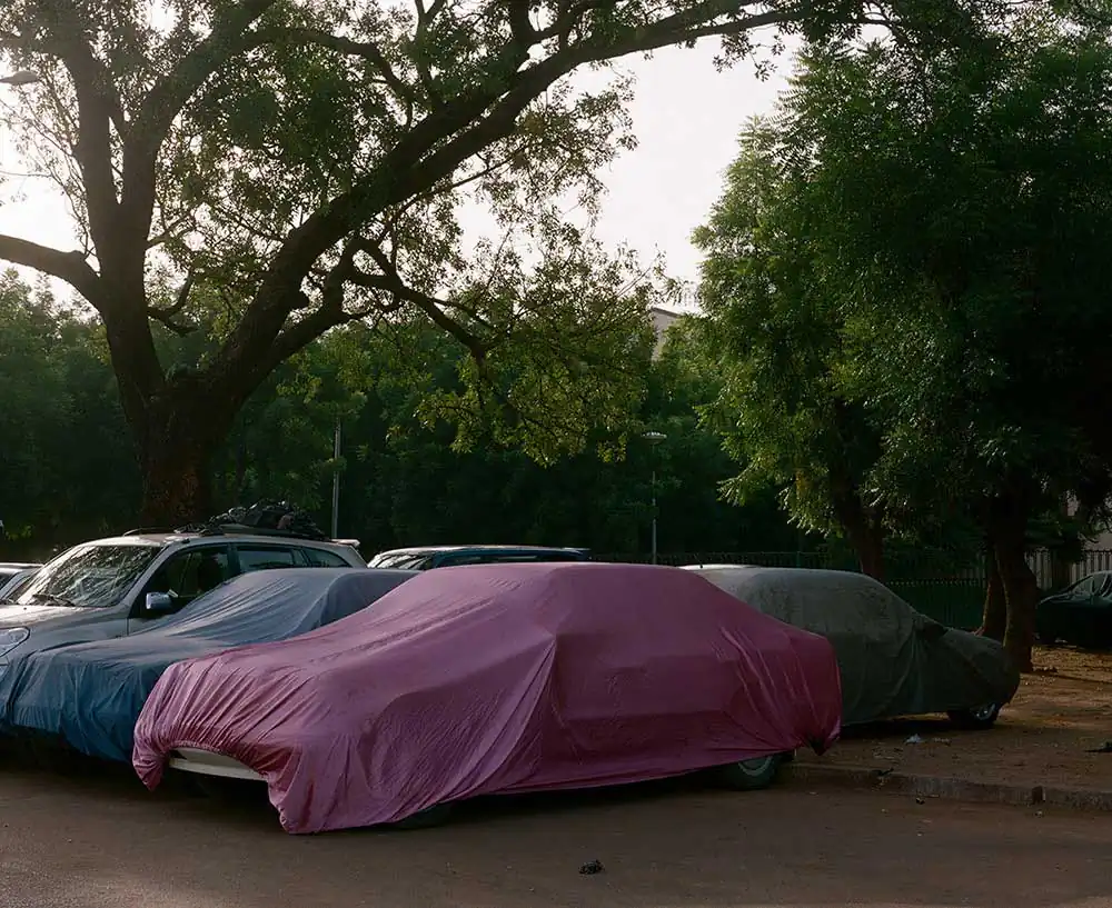 In order to better underline the importance attributed to the car by our contemporaries, Frédérick chose to show it masked, to surprise it in its sleep, often shadowed by the homes of its owners. Under its protective cover, you imagine it more or less luxurious just through a glimpse of a rim, or when the shroud clings to it after the rain, making it confess its sportive shape. Camouflage becomes a way of revealing what the driver in Japan, London, Athens or Bamako hopes to see it metallically embody. Frédérick’s photographs are windows that let us imagine the relationship, the intimacy even, of man and his machine, because none of the protagonists is unmasked. As Aragon says in the same poem: