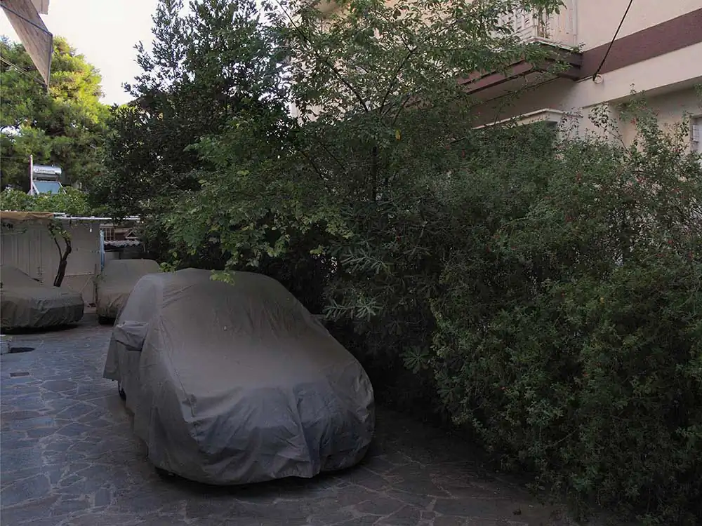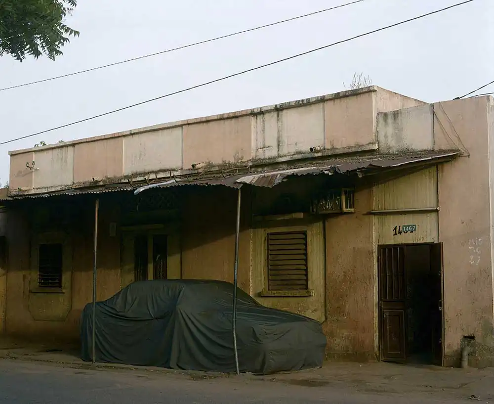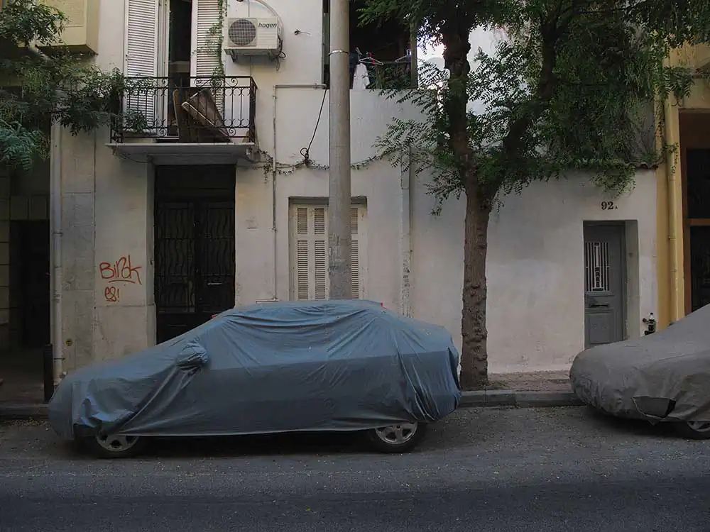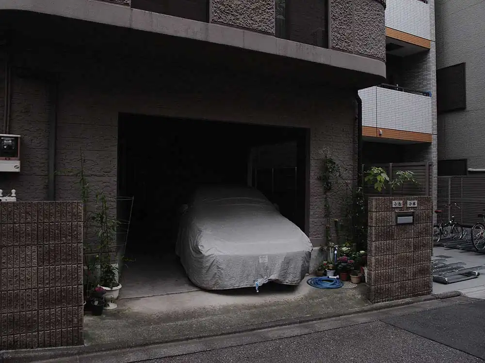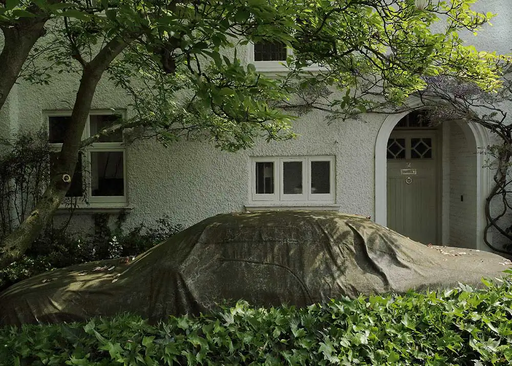 In order to better underline the importance attributed to the car by our contemporaries, Frédérick chose to show it masked, to surprise it in its sleep, often shadowed by the homes of its owners. Under its protective cover, you imagine it more or less luxurious just through a glimpse of a rim, or when the shroud clings to it after the rain, making it confess its sportive shape. Camouflage becomes a way of revealing what the driver in Japan, London, Athens or Bamako hopes to see it metallically embody. Frédérick’s photographs are windows that let us imagine the relationship, the intimacy even, of man and his machine, because none of the protagonists is unmasked. As Aragon says in the same poem: