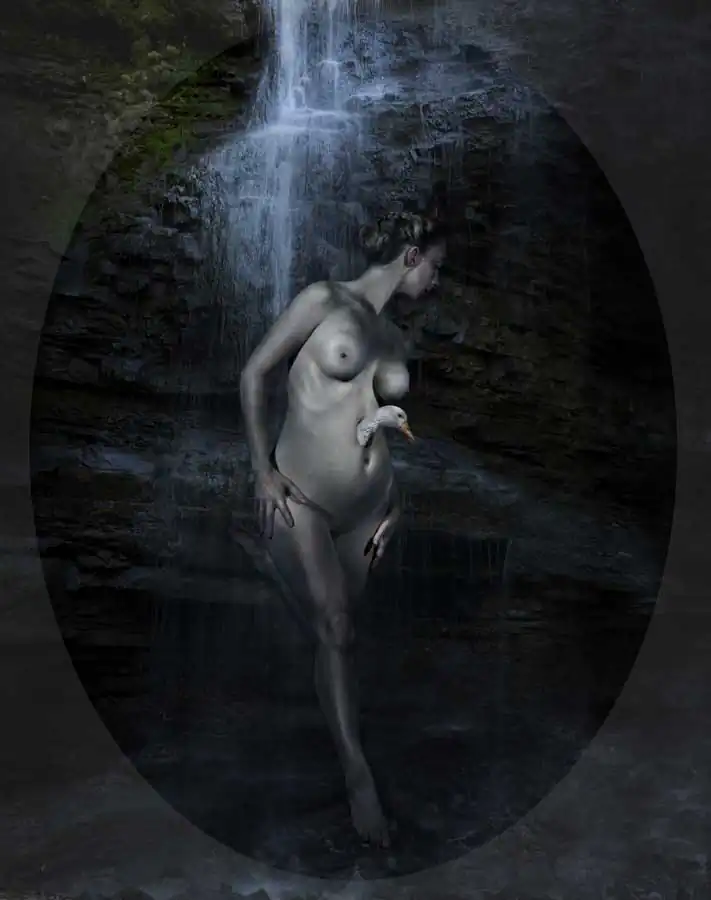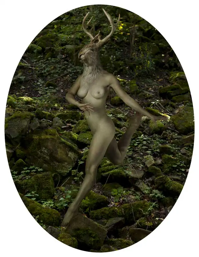 The goddess is sometimes depicted with horns or antlers in the images to reference the horned god, a primary deity found in neopagan religions, in which he is associated with nature, sexuality, hunting and life cycle. Christianity co-opted with this character and conceptualized him as evil (the devil), especially due to the association with sexuality. The horned goddess in these works embraces sexuality and sexual expression. The portraits of the goddess with a halo reference Christian religious iconography, mocking depictions of Jesus Christ and The Virgin Mary. Furthermore, the oval shape, lighting and the painterly esthetic of the images were influenced from Baroque painters like Frans Snyder, Peter Paul Rubens, and Jan Weenix. [Official Website]