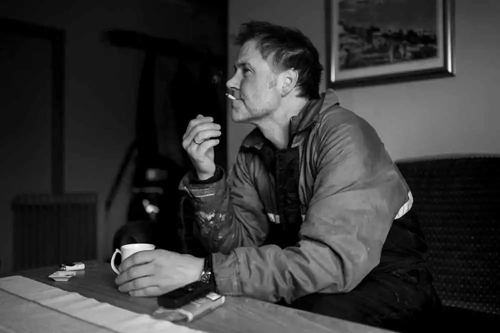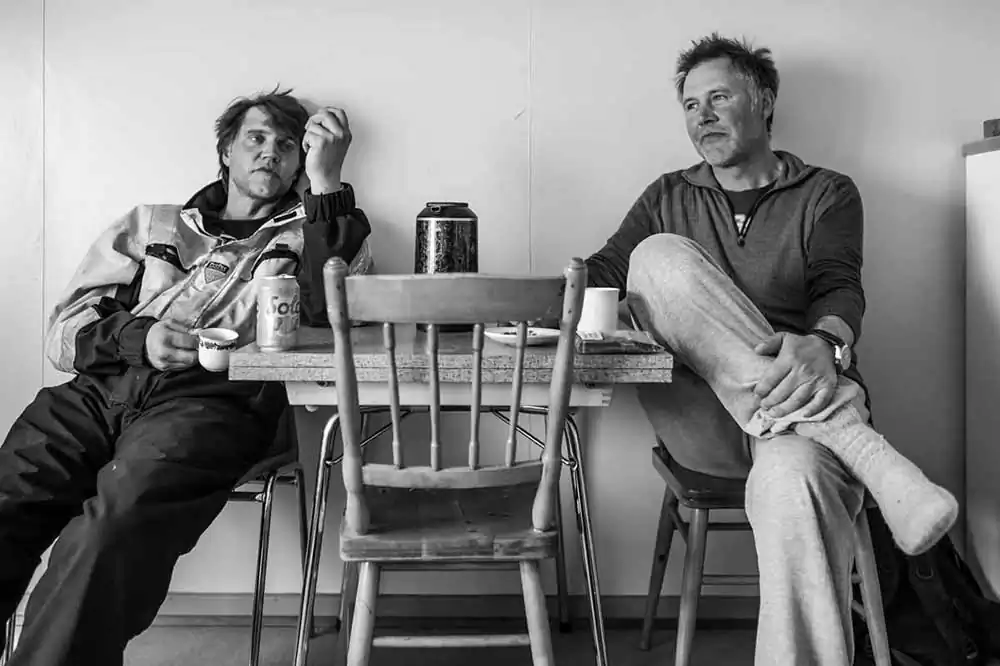 This time of year the sea can still be quite rough and experiencing all four seasons in one day is no exception. I was amazed to see that those local fishermen in their forties muster day after day the strength, energy and love for their trade. Even on days when going to sea is not on the agenda, due to weather conditions or a lesser catch the previous day, mending the nets, boat repairs and maintenance keep them occupied. Their respect for the sea and the elements makes them expert judges on where and when to harvest, when it is time for maintenance and repairs, to rest, or socialise with friends and family at the local pub with a beer, or two, but frequently more. The once linear experience of time makes room – extended with the rise of the midnight sun – for a schedule that does not include the idea of free weekends or for that matter, a “normal” circadian rhythm all together. During the height of the fishing season Stig and Tom are assisted by Torstein. Torstein lives in Bodø, a four-hour boat journey to mainland Norway. Well in his fifties Torstein has been a loyal ship’s mate to the Jørgensen duo for over fifteen years. His story is no different from that of any other non-local fishermen who migrate for an eight month period to Røst, leaving behind their families in order to make a living. For eight months the rorbu – a fisherman’s cabin that also serves as a place for stocking boat utilities and fishing equipment – located at the docking jetty in the marina, becomes his home. Although rudimentary in terms of comfort, the rorbu has a sense of cosiness and belonging with regularly held boiled coffee and smoking sessions when on terra firma. The fisherman longs for the sound of silence and therefore seems quite the loner. It is the quietness, the freedom from mental clutter that draws him out to the vast sea in the early morning. The men talk, enjoy their “roll-ups” and seem to mentally withdraw at regular intervals. A heavy but relaxing silence fills the room. A last pull on the cigarette butt and it is back to work.