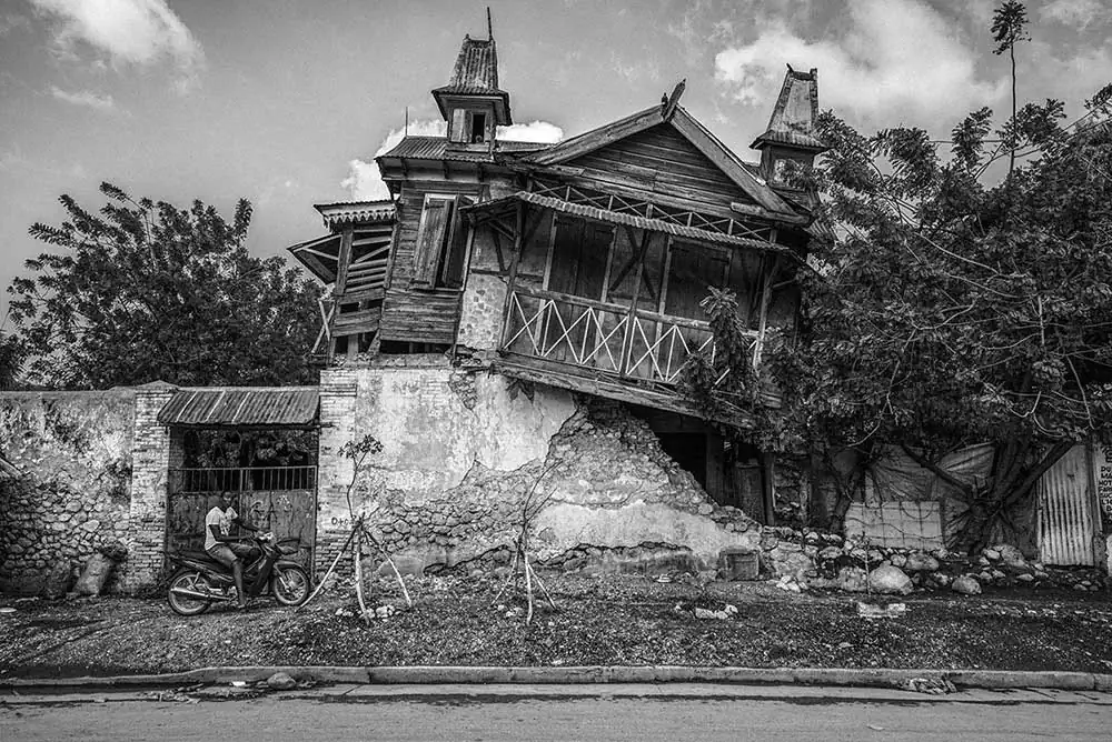 ‘THE EPICENTER’- LEOGANE, HAITI. JANUARY 19, 2015. An unposed moment of a young man on his motorcycle outside the crumbling ruin of a building in Leogane, some 25 miles from the Haitian capital of Port-Au-Prince. Following the devastating 7.0 earthquake in January 2010, a United Nations disaster-response assessment team reported that this was ‘the worst-hit area’ with over 25,000 deaths and upward of 80% of all concrete structures destroyed.