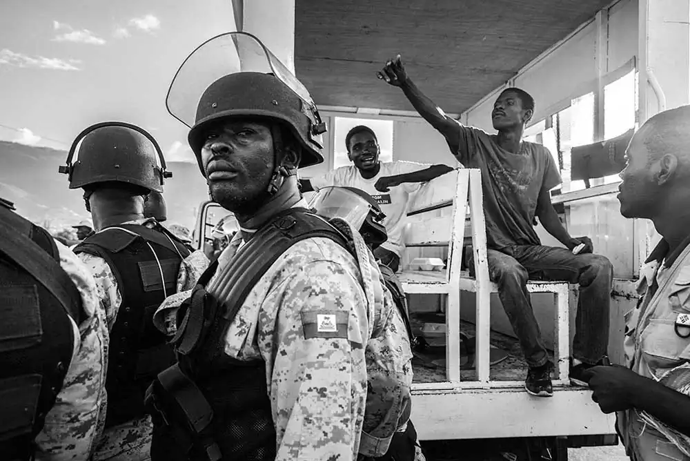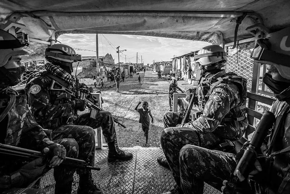 ‘RIDING WITH UN PEACEKEEPERS’ – CITE SOLEIL, PORT-AU-PRINCE, HAITI. JANUARY 10, 2015. A young boy runs after and shouts at UN Peacekeepers while on patrol in a troubled neighborhood of downtown Port-Au-Prince. Following the 2010 earthquake, a United Nations peacekeeping base upstream from the capital was later found out to be the source of what became the worst cholera outbreak in the beleaguered nation’s history. The Brazilian UN Peacekeepers pictured here are part of a revolving peacekeeping force that have been stationed in Haiti since 2006 following the breakdown of the then Aristide government and military rule.