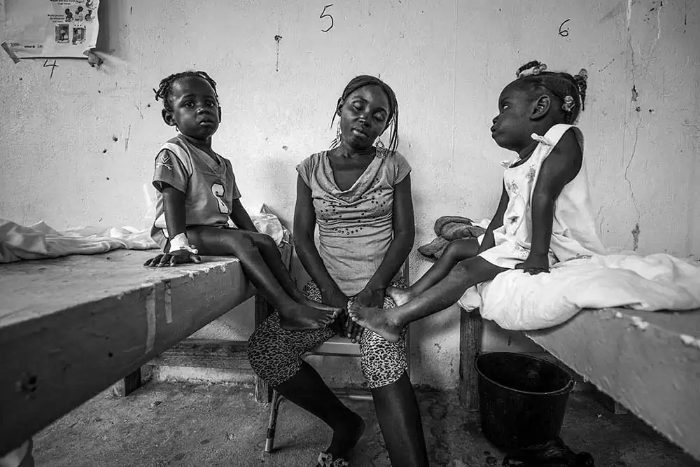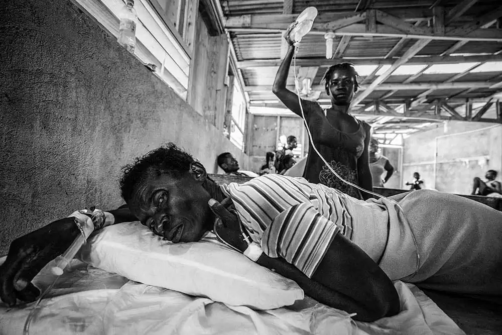 ‘IN THE GRIPS OF CHOLERA’ – LES CAYES, HAITI. OCTOBER 15, 2016. At a makeshift medical treatment center in downtown Les Cayes, a concerned son holds his weak mother’s wrist while talking on his mobile phone to relatives. According to World Health Organization figures (released at the end of October 2016), an estimated 1,300 people had contracted cholera after Hurricane Matthew ripped through the area on October 5th, 2016.