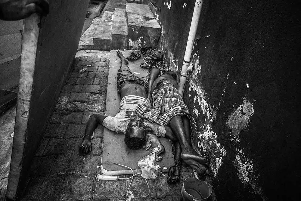 ‘CITY MORGUE OVERFLOW’ – PORT-AU-PRINCE, HAITI. MAY 7, 2015. A man, a woman and her baby lie dead next to a wall outside the city morgue. They were lying behind a wooden board that when pulled back revealed the bodies. I was told by morgue workers close-by that continual power cuts (corpse refrigeration) and lack of city funds for proper disposal meant that bodies would be stored crudely until family members came to claim the bodies. In many case however, bodies were left unclaimed so were buried in mass graves later. Haitian culture prevents cremation.