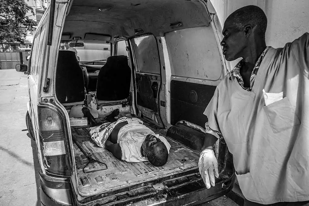 ‘MORGUE ARRIVAL’ – PORT-AU-PRINCE, HAITI. MAY 7, 2015. A morgue worker opens the back of a van after having picked up a body from an undisclosed location. The dead man’s arms were tucked inside his shorts while he was moved from his place of death to the mortuary.