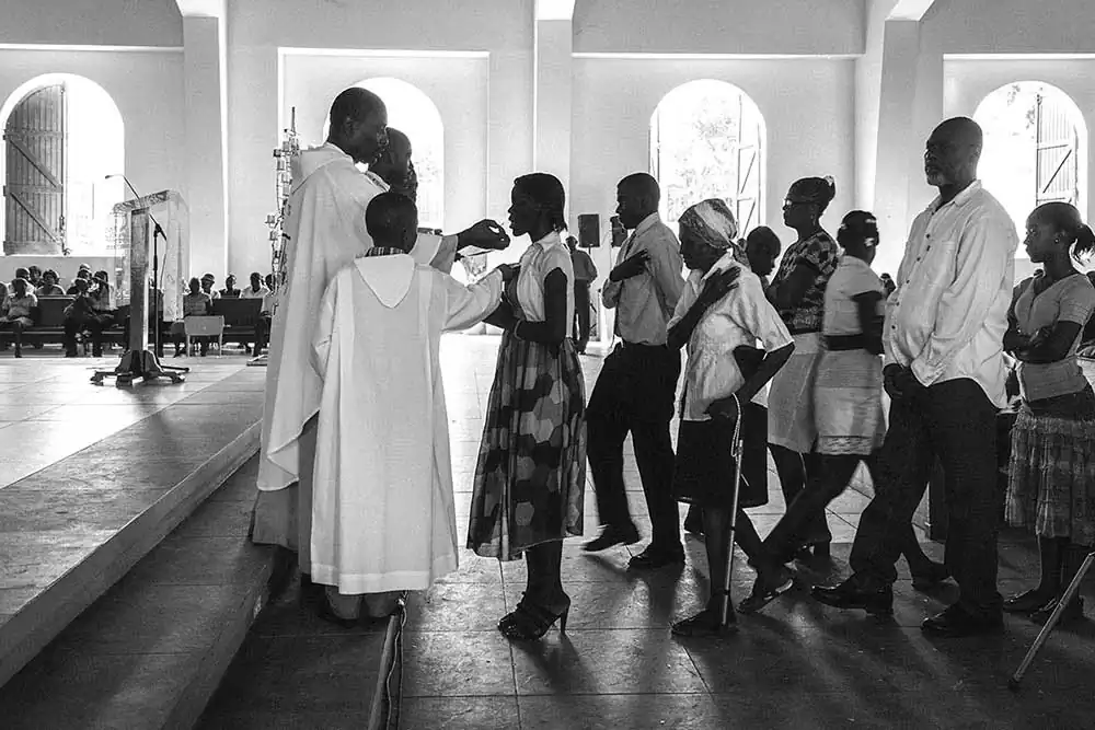 ‘HOLY COMMUNION’ – PORT-AU-PRINCE, HAITI. JANUARY 11, 2015. Churchgoers attend a 5th earthquake anniversary service in the newly-built annex that lies directly next door to the crumbled ruins of the The Cathedral of Our Lady of the Assumption.