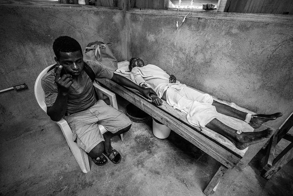 'IN THE GRIPS OF CHOLERA' - LES CAYES, HAITI. OCTOBER 15, 2016. At a makeshift medical treatment center in downtown Les Cayes, a concerned son holds his weak mother's wrist while talking on his mobile phone to relatives. According to World Health Organization figures (released at the end of October 2016), an estimated 1,300 people had contracted cholera after Hurricane Matthew ripped through the area on October 5th, 2016.