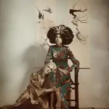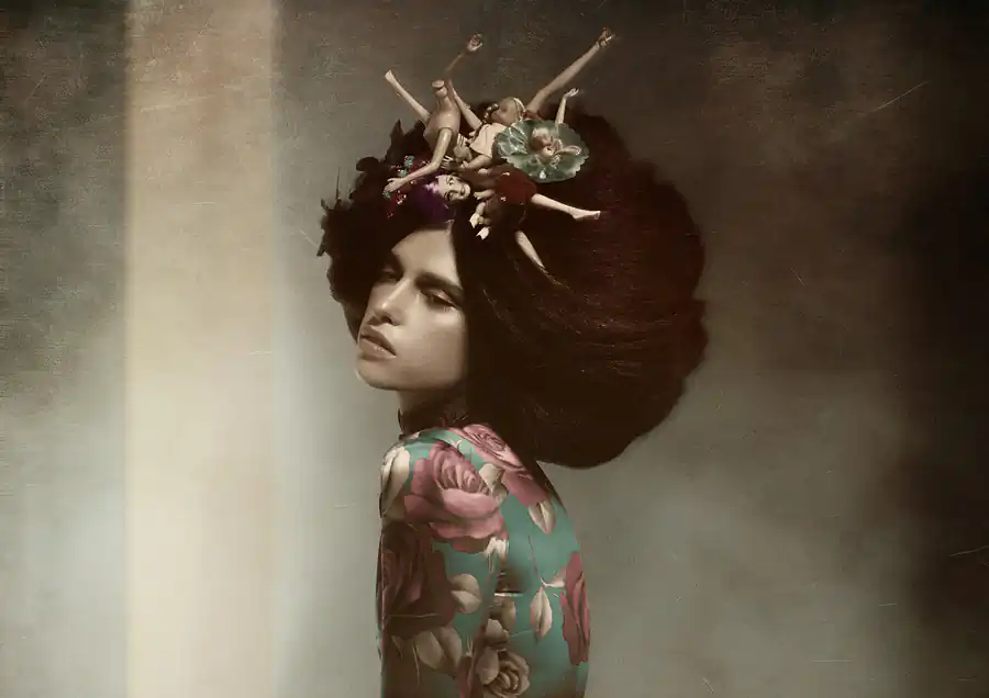 All the sets were built by the artist and his team. Most of the clothing was created for the project, as were the decorative set-prop items such as paintings, backdrops, tapestries and floral arrangements.