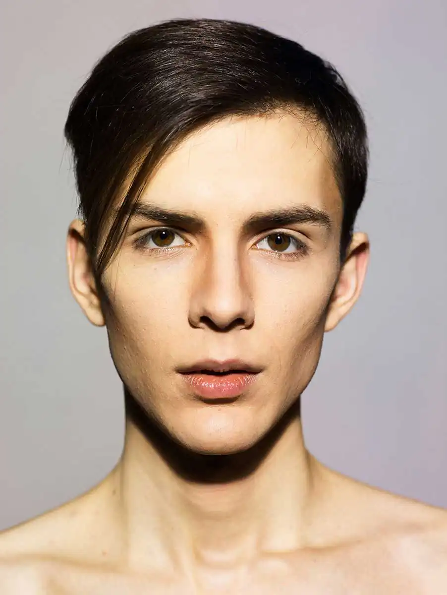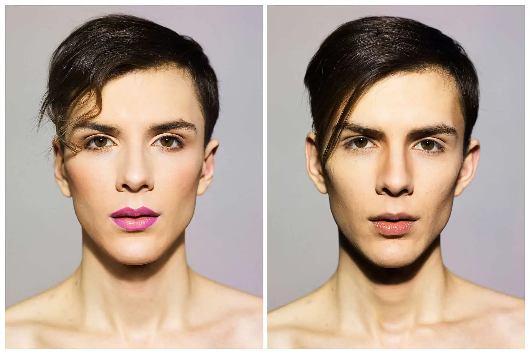 Our subjects were all friends and acquaintances, selected because some of their facial features looked to us transposable to the opposite gender. The challenge, working exclusively with non-professional models, was for the resulting images not to become a caricature, as we soon realised even minor changes in expression or pose could turn them into mockery. The portraits were then combined into diptychs according to purely aesthetic values and personal appeal.
