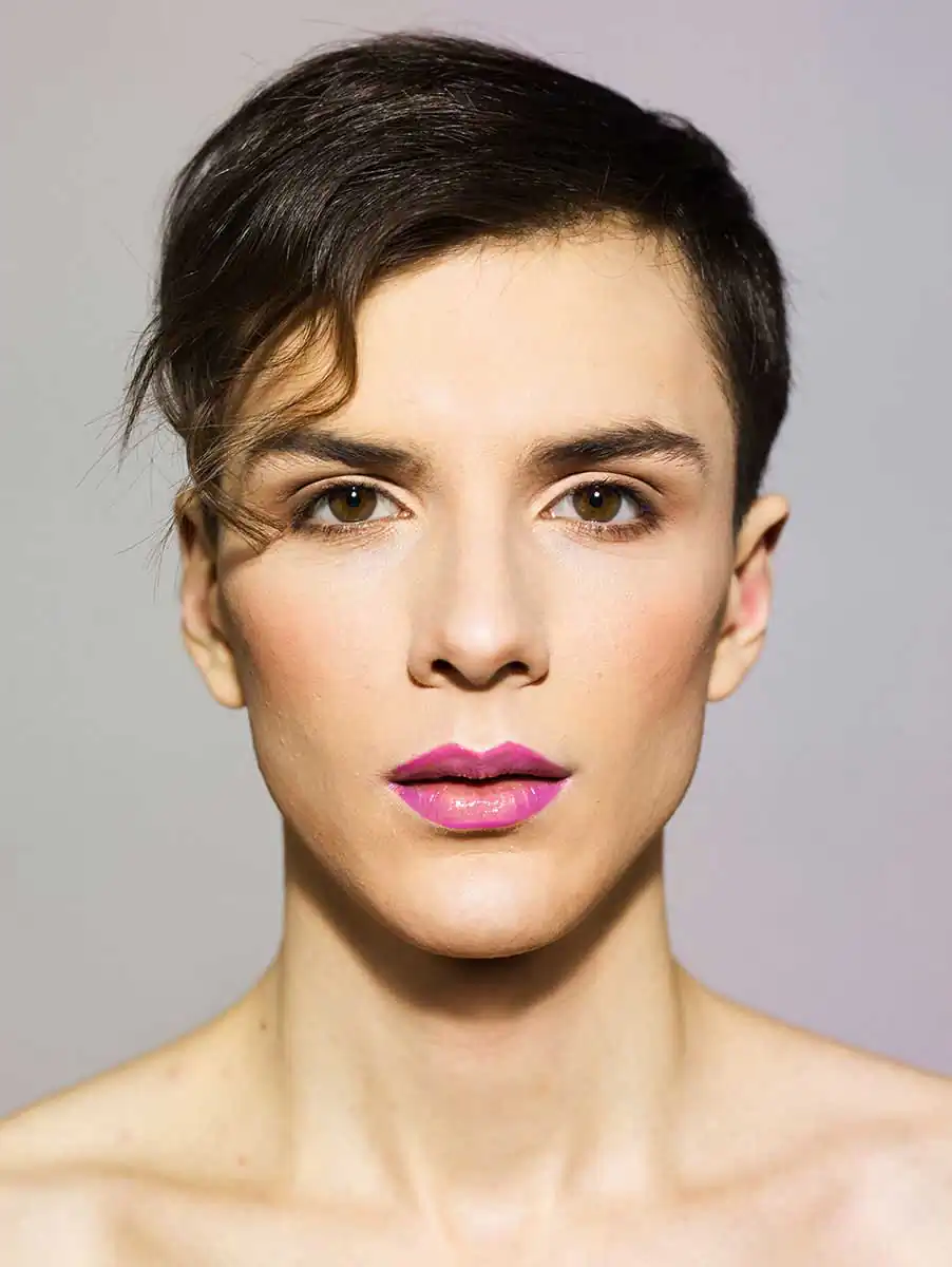 Technically, I used a single light on both subject and background – which was neutral or matching the subject’s eye colour – while Lucia worked skilfully on the makeup. A part from some retouches to either soften or accentuate the models’ Adam’s apple, no image was photoshopped in postproduction, leaving only the lighting, the makeup and the subject’s facial expressions to convey the symbolic gender reassignment.