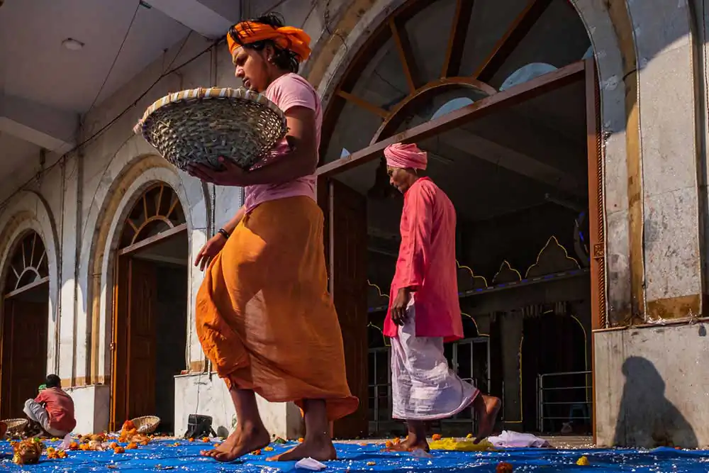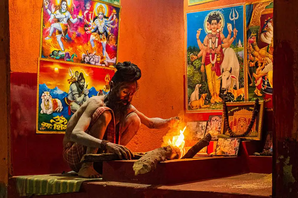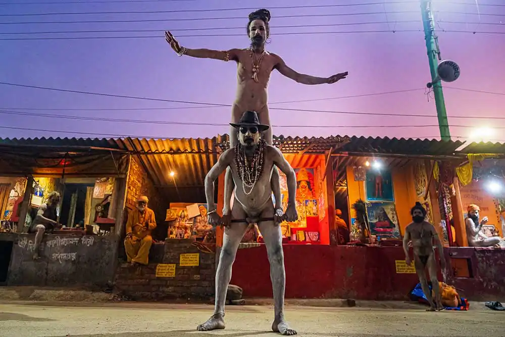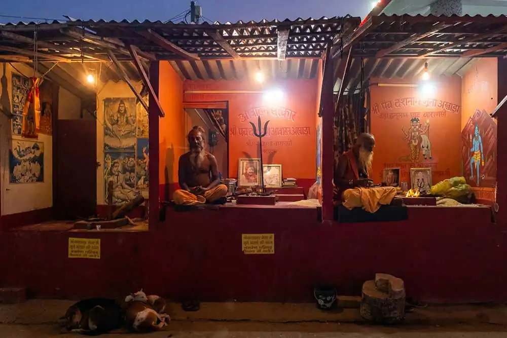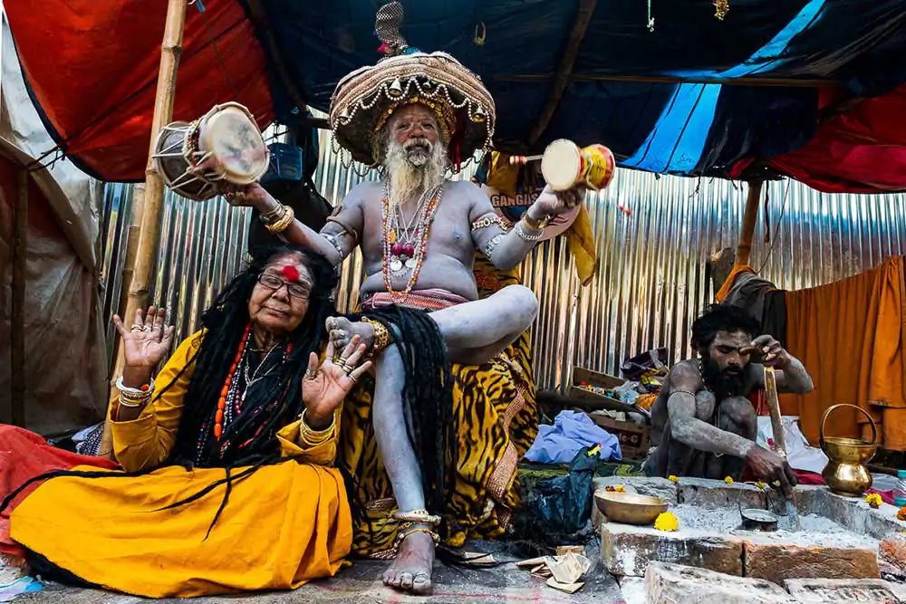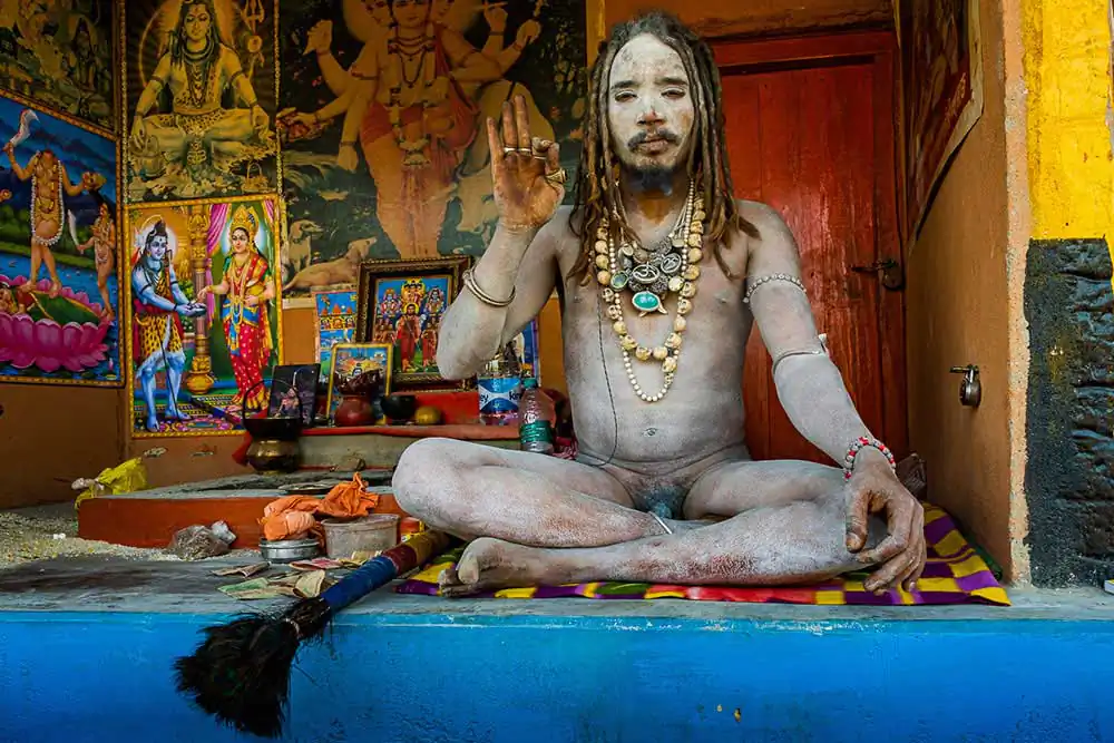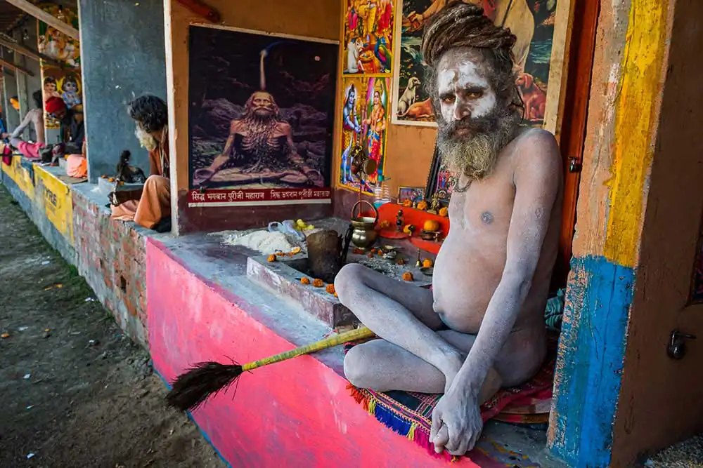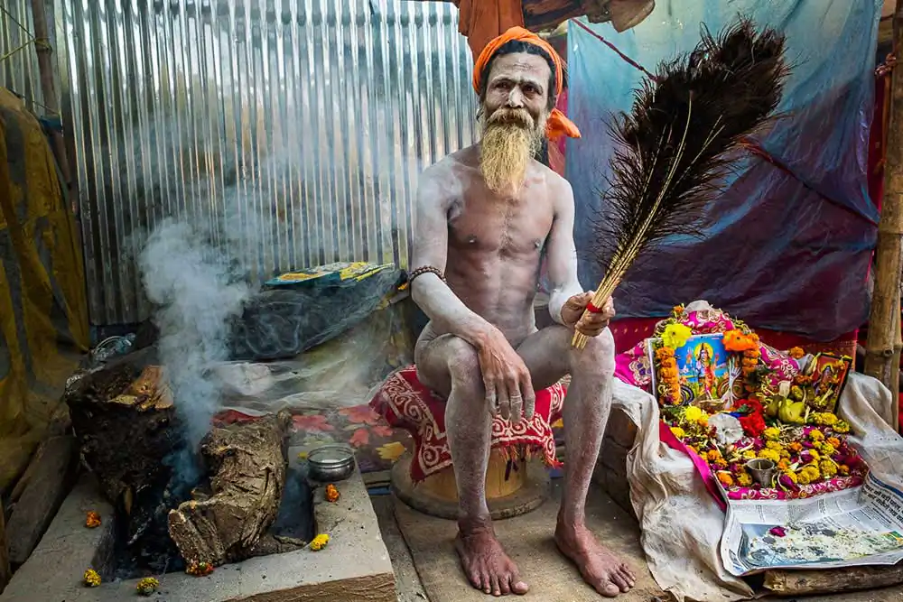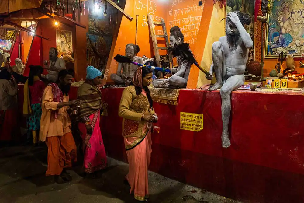 When pilgrims finally arrive at the Mela, they make their way to the Cape Munil temple to make offerings and be blessed with one of the numerous priests. Next to the temple is a long array of small cubicles decorated with colorful images of Hindu gods and marigold flower garlands. Each one of these cubicles is “inhabited” by a Naga Sadhu, looking like a ghost with his naked body smear with ashes. The sadhus are holding court, performing rituals, and ready to give the pilgrims blessings, tapping them on the head with peacock feathers. Beware, some of the rites involve showing their followers that they control their bodies and that their bodies mean nothing.