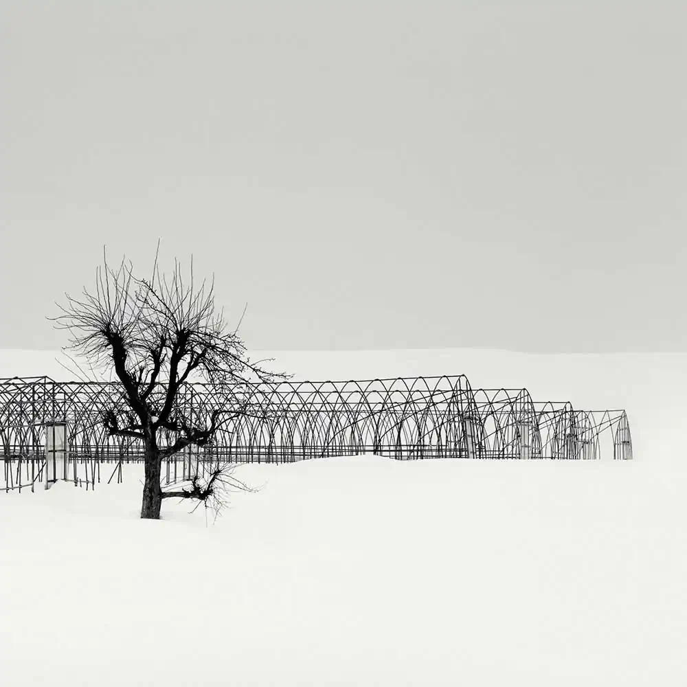 These elements like snow fences, vineyards poles or greenhouses deeply call me to mind for their singular expression in the snowfields and sometimes for their spiritual presence like the gorgeous Torii of Konpira Shrine. The trees and the way they have been organized are also very representative sceneries of the winter in Hokkaido.