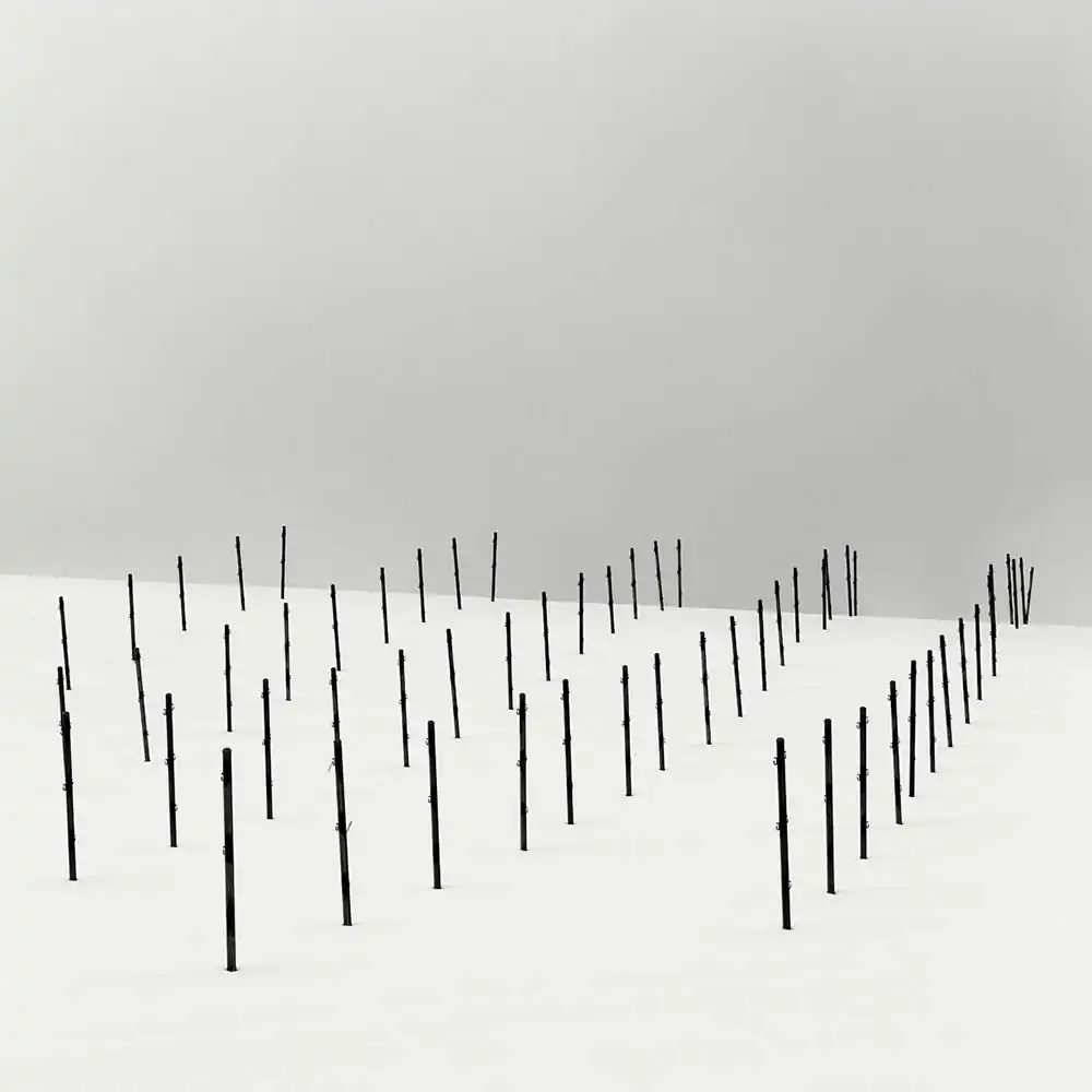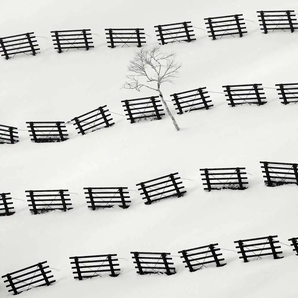 The snow fences are very typical elements of the landscapes in the snowy regions of Japan. Although these fences seem to have been randomly dropped, they are particularly efficient and have been methodically installed according to the wind direction. I’ve always been attracted to their presence on the pristine snow and the way they organize the sceneries, playing elegantly with trees like notes on a musical score.