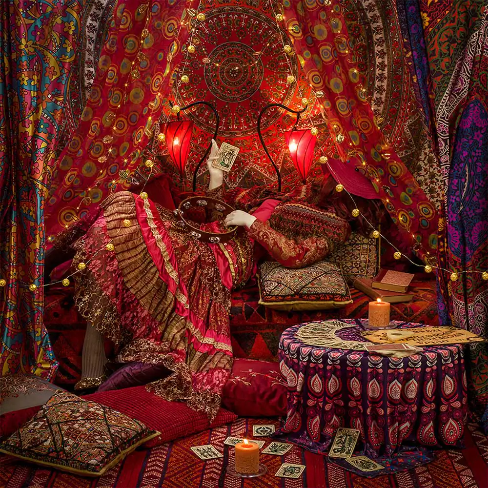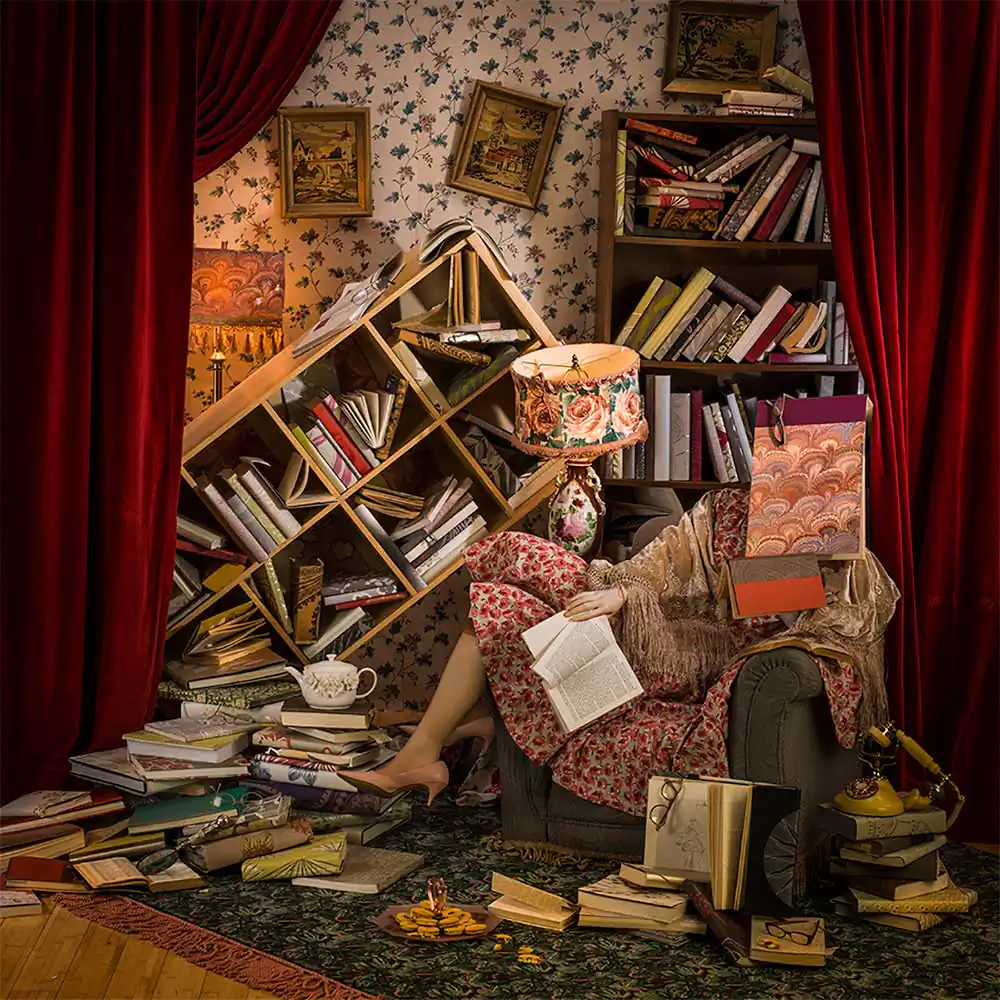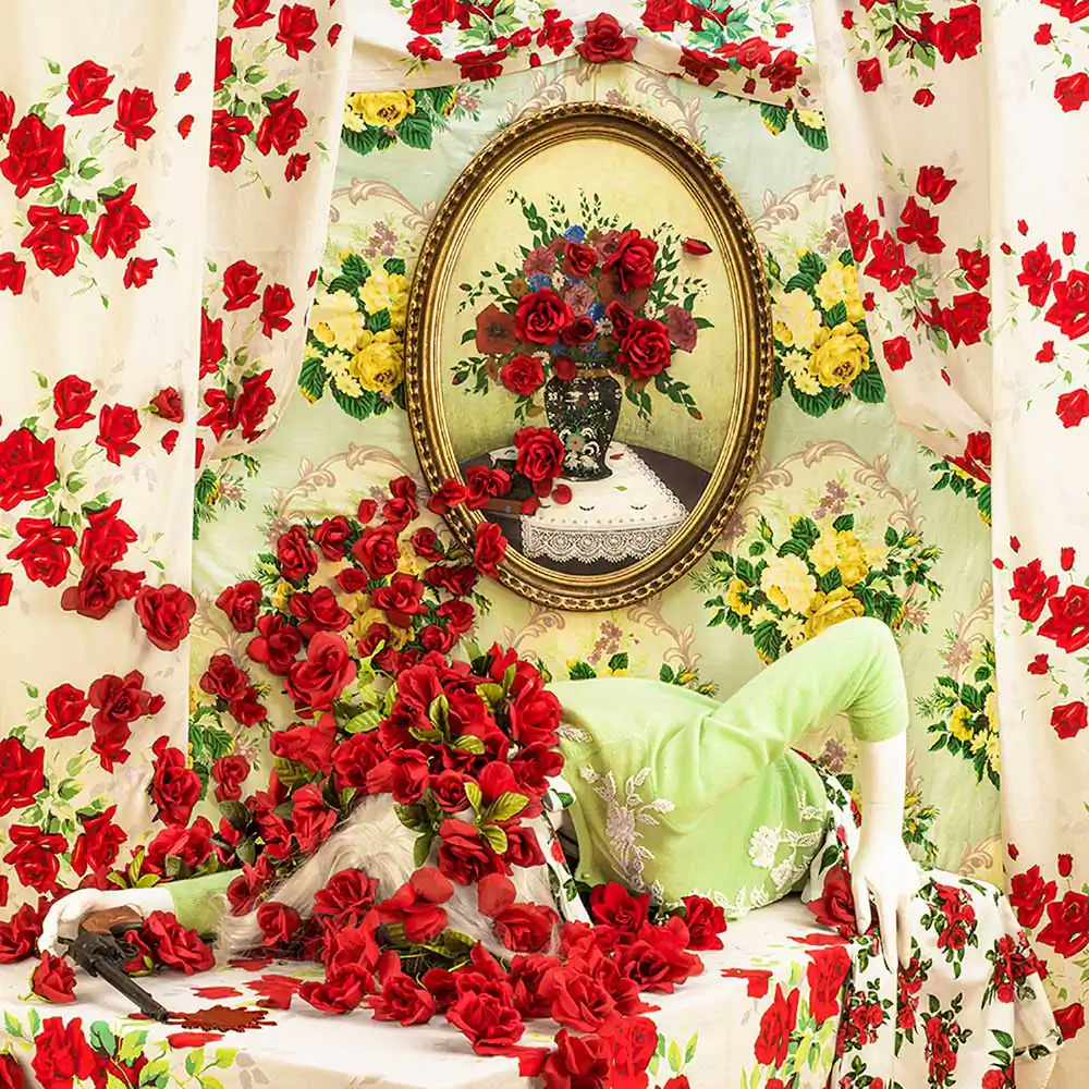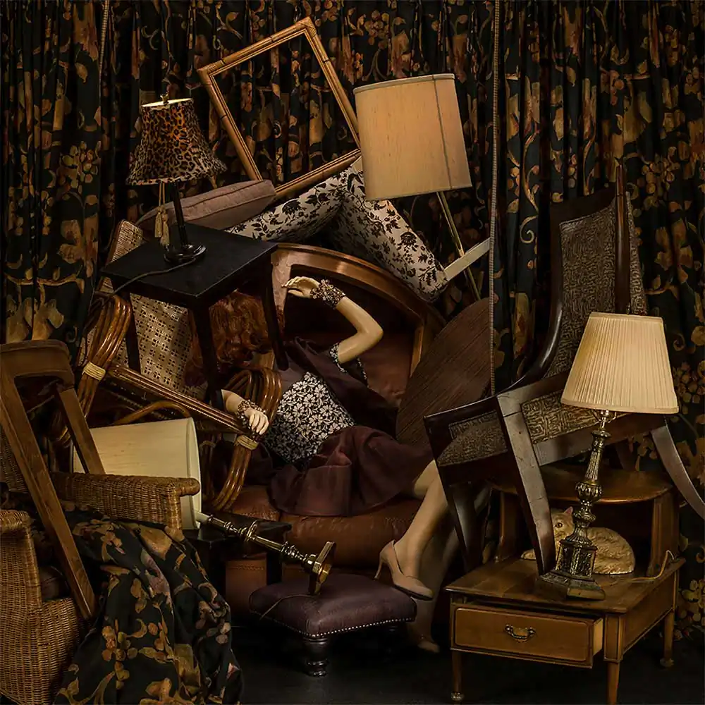 My work is about entangling women and home, leading to the phrase “housewife.” All of the photographs are reimagined interior spaces of rooms filled with décor and objects, engulfing a lone figure of a woman, camouflaged, often with only bits of her visible.