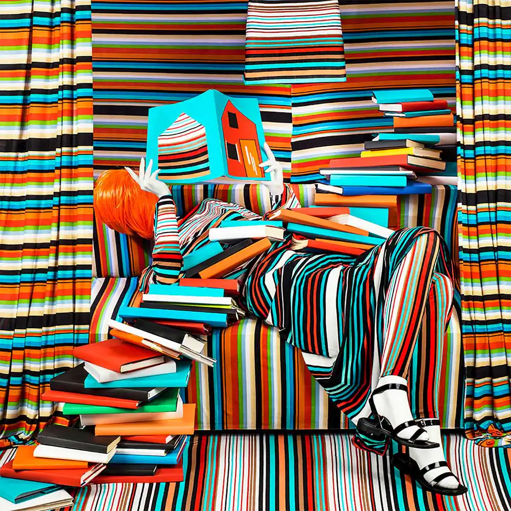 Patty Carroll has been known for her use of highly intense, saturated color photographs since the 1970’s. Her most recent project, “Anonymous Women,” consists of a 3-part series of studio installations made for the camera, addressing women and their complicated relationships with domesticity. By camouflaging the figure in drapery and/or domestic objects, Carroll creates a dark and humorous game of hide-and-seek between her viewers and the Anonymous Woman. The photographs are published as a monograph, Anonymous Women, officially released in January, 2017 by Daylight Books.