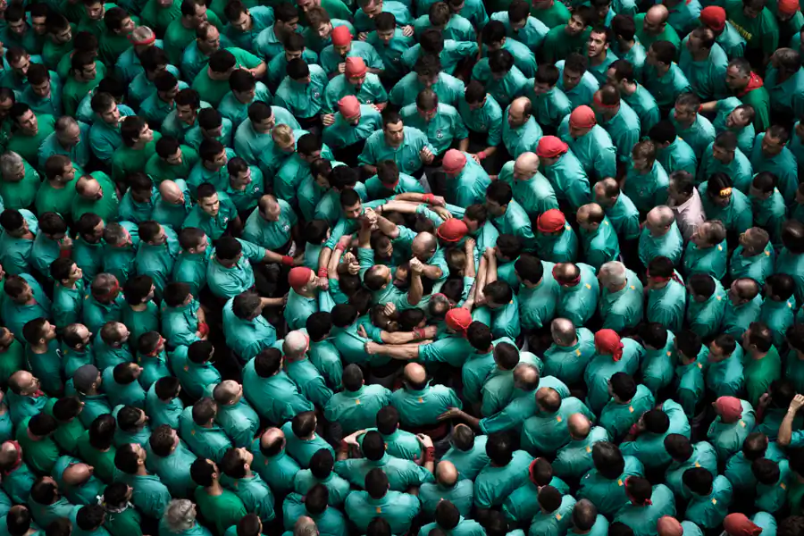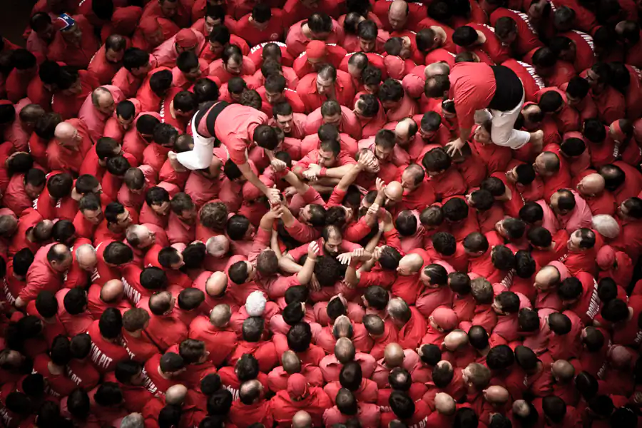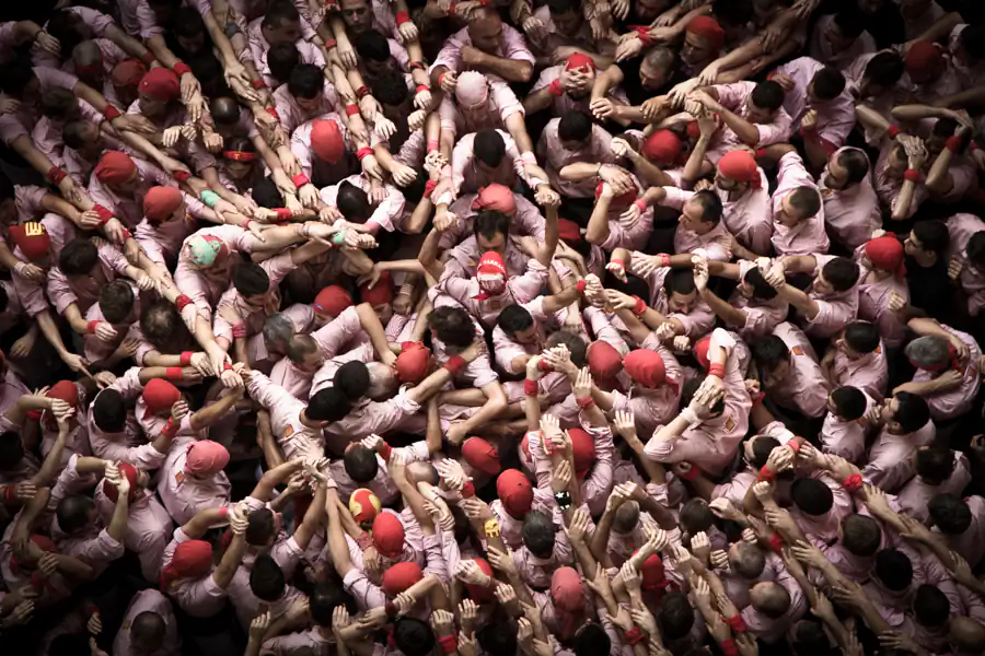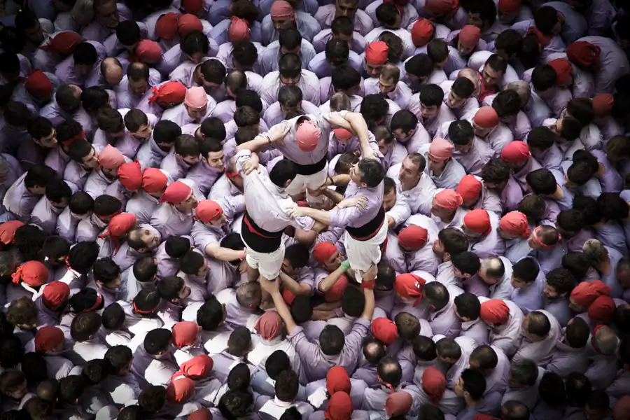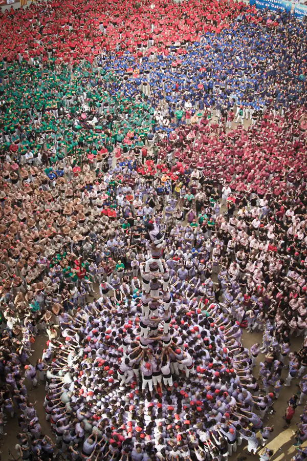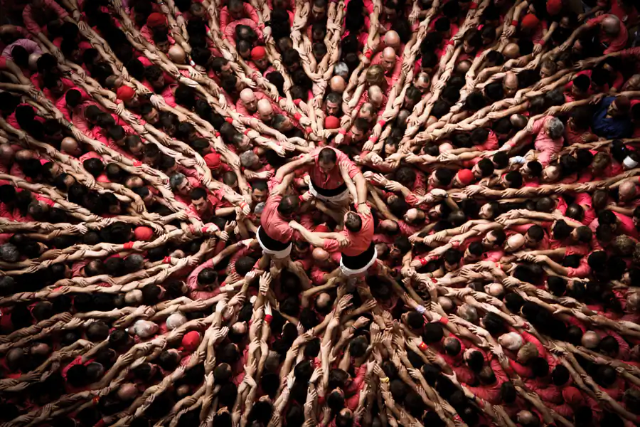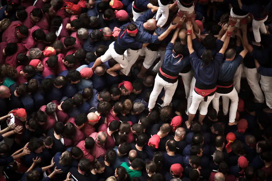 During these events each team (known as “colla”) builds and dismantles its own human towers. For their success, a crowded and stunning base of hundreds of people needs to be previously perfectly set up. The most important Human Tower Competition takes place in the city of Tarragona once every two with the participation of more than 30 “colles” from all around Catalonia and a live audience of more than 20.000 people. During the competition, the higher and difficult to build a tower is, the more points a team gets. Every human tower is usually between six and ten levels high.