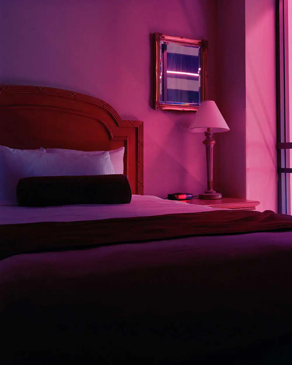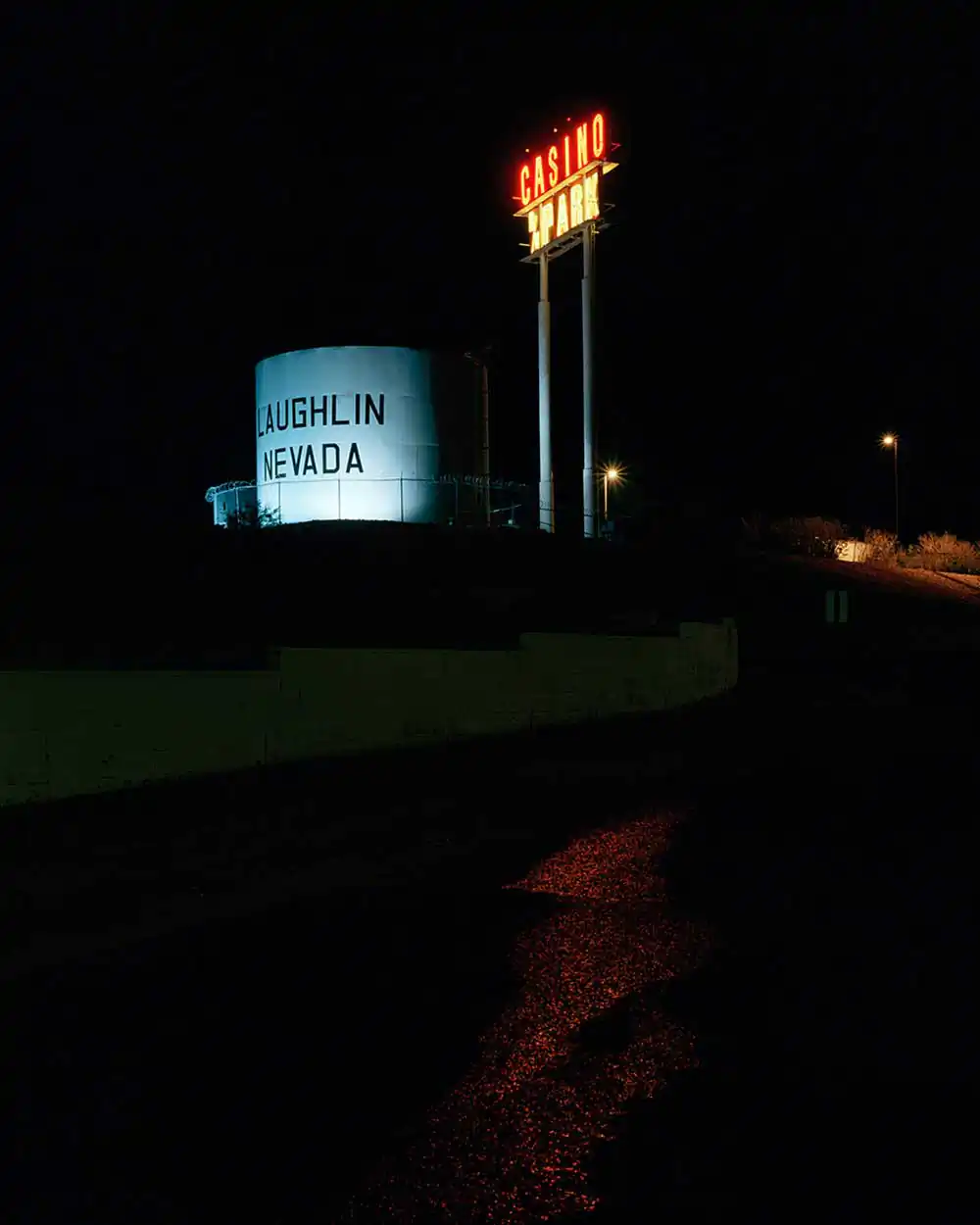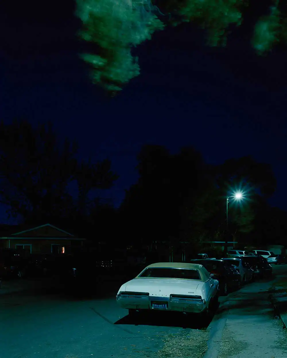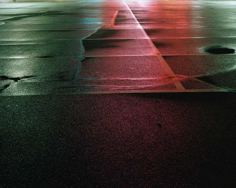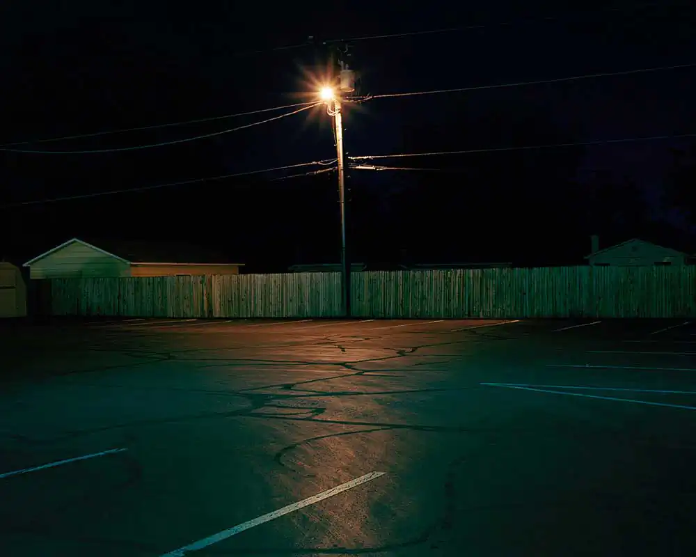 As a slight nod to classic landscape photographers Joel Sternfeld and Stephen Shore, Egan has chosen to work with a large format view camera and color negative sheet film for this series. This choice seems to enhance and elevate the overall vision. His approach is “slowed and more deliberate with the view camera.” Seeing the night through the ground glass “is a beautiful thing” states Egan but “can be quite challenging focusing and framing given that the scenes are not always as illuminated as they appear in the photographs.” The long exposure times bring life to scenes that could otherwise be missed.