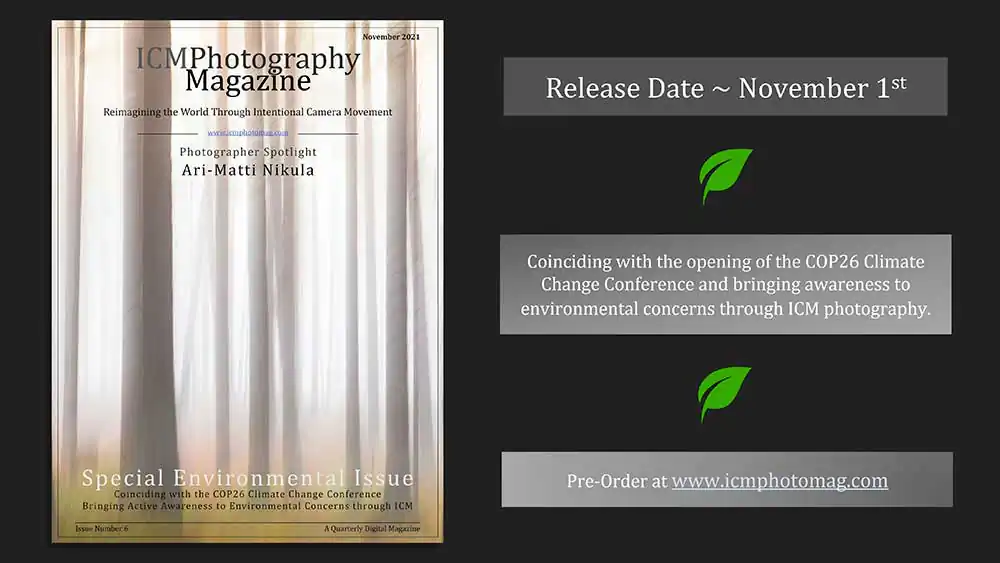 In this special November issue, there will be more than a dozen featured articles showing the ways ICM photographers are being proactive in effecting change and using their ICM creativity to bring awareness to environmental concerns.
