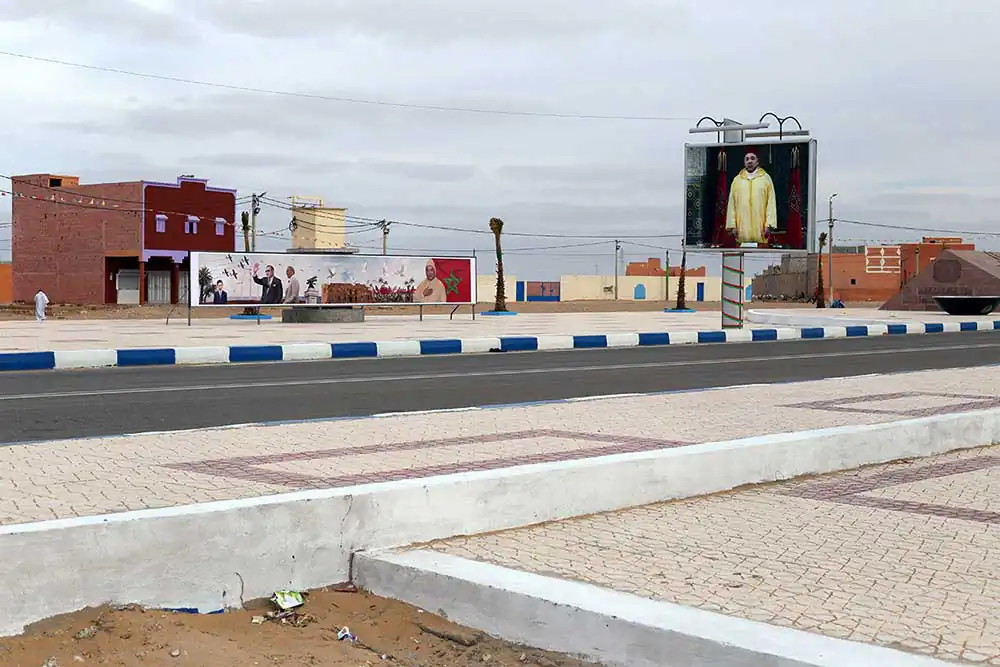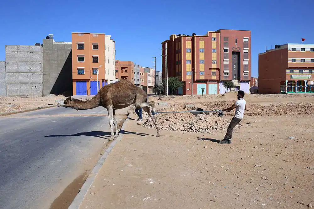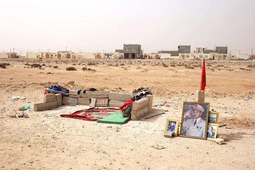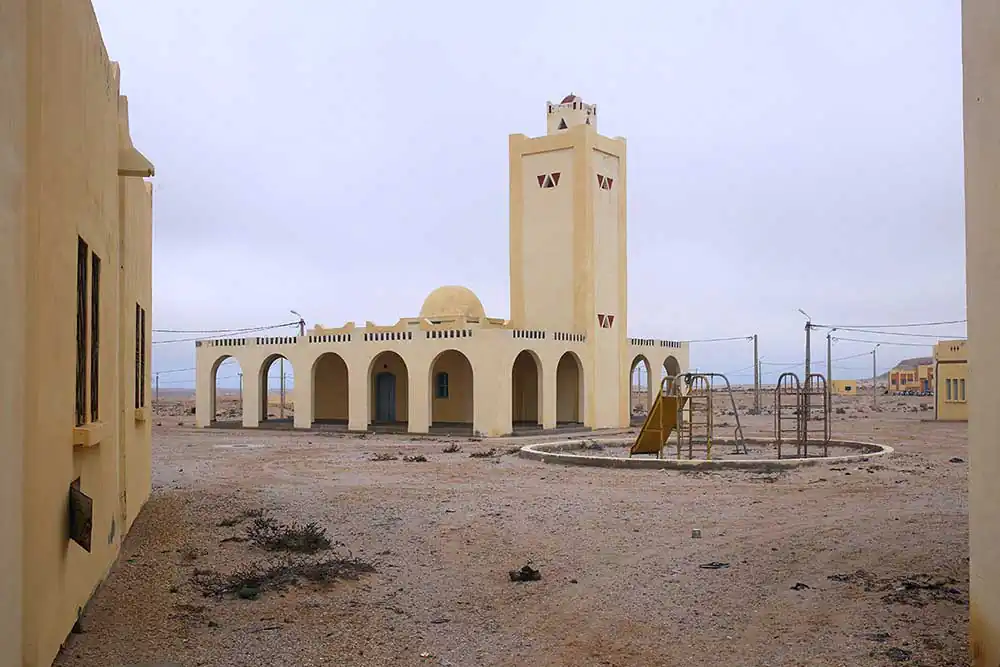 Using ‘fait accompli’ tactics, Morocco has demarcated a territory, defending it with a 2500km long wall. The occupation of this land is an effort to render the right of the Sahrawi people to a referendum of self-determination obsolete. Moroccan strategy involves militarization of the desert, exploitation of ressources, town planning, settlement campaigns for Moroccans and the wiping out of Sahrawi culture.Moroccan constructions in the desert are the tangible form of this territorial con ict which has been dragging on since 1975