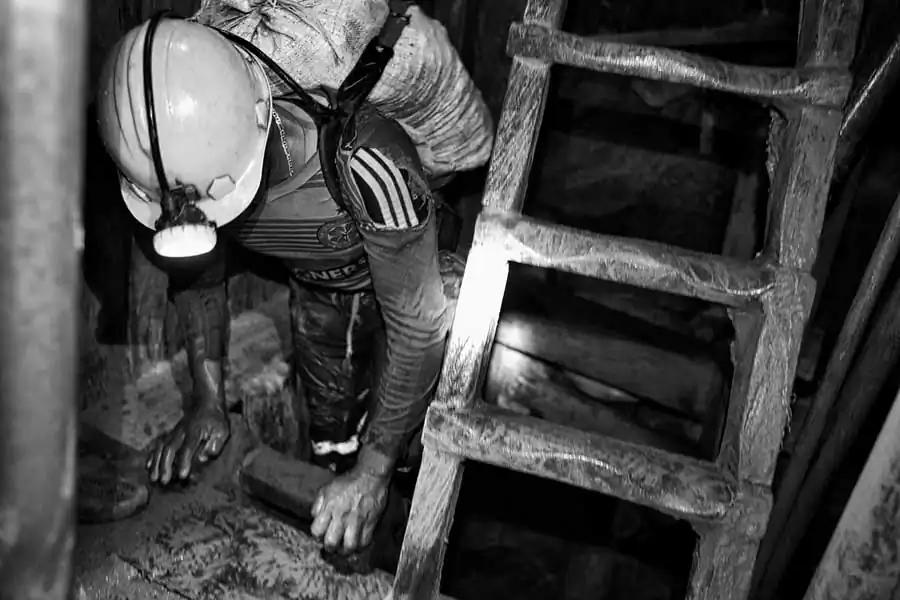 This time their prayers are answered as the old engine restarts. Joking about what has just happened, but visibly relieved, the miners go back to work, each to his own task. They dig using pickaxes, filling sacks of 75kg and, carrying them on their shoulders up to the surface. Seven journeys for each person. Seven kilometers vertically with a total weight of 525kg each day.