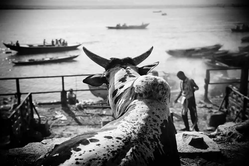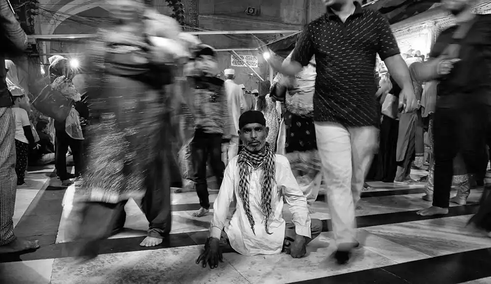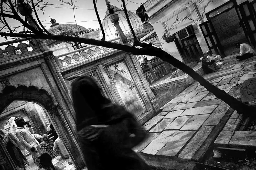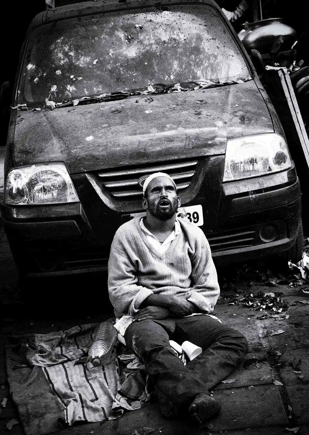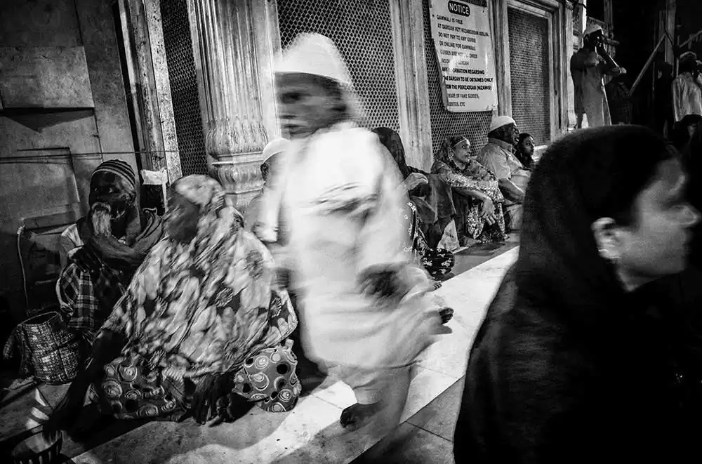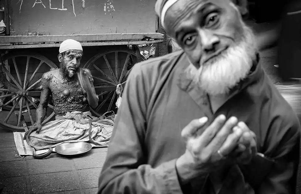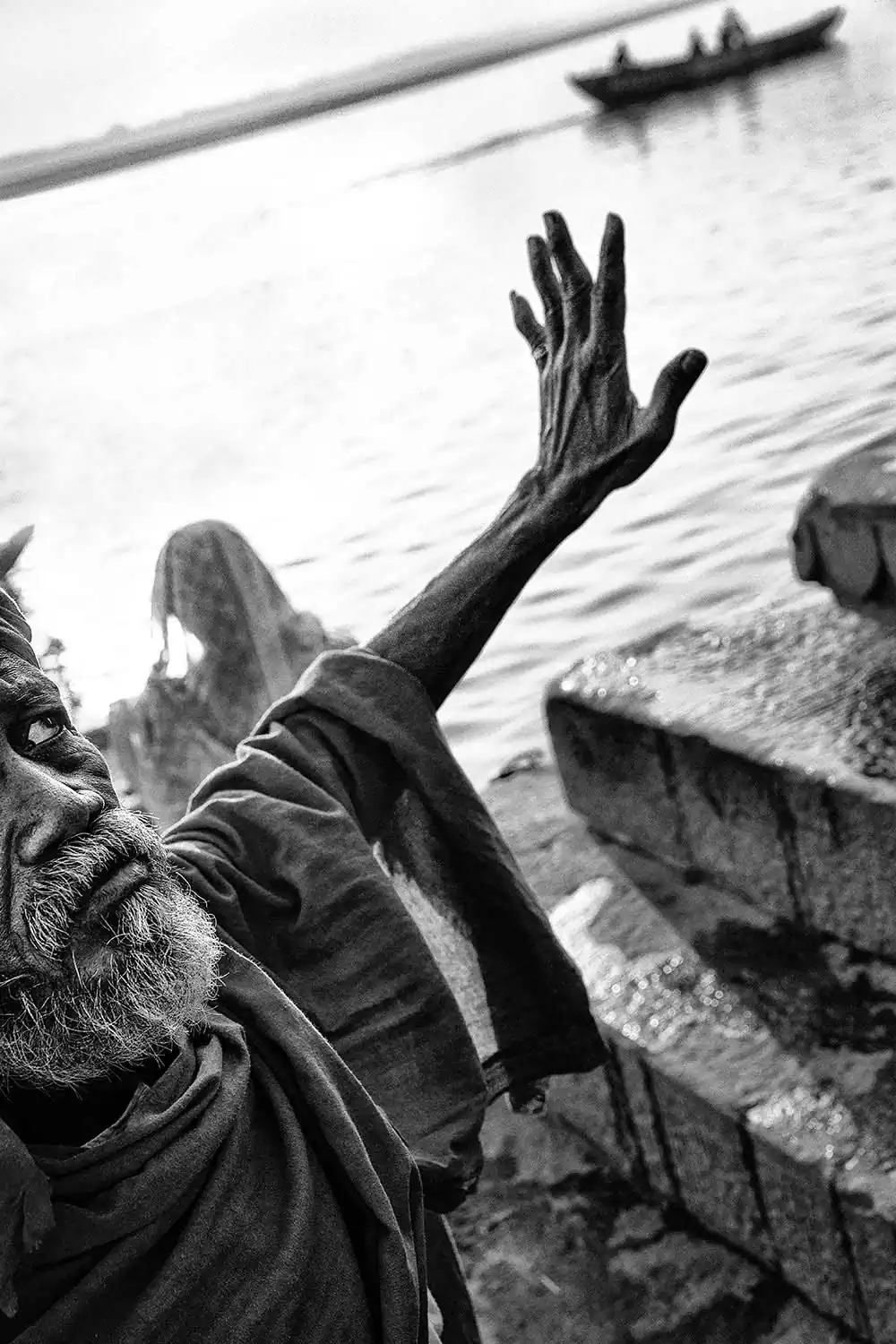 Worship ritesHazrat Nizamuddin Aulia DargahHazrat Nizamuddin Aulia Dargah – In India, maimed people are commonly found in streets. This man in Hazrat Nizamuddin Aulia mosque had legs, but they were of no use to him. Delhi, 2018.Varanasi is punctuated by small temples opening up on the streets where people worship the Hindu deities.I noticed in the distance that old man stretching out his arm towards the waters of the Ganga river.A leprous man and a beggar – Leprosy is still widespread in India. I spent a long time on that street, the leprous man didn’t mind the presence of my camera. After some time a beggar came, his movements were singular, with his head lolling on his bending chest. The moment was eventually broken by a policeman who brought the leprous man away, for some reason that I ignore. Nizamuddin West, Delhi, 2018.Newspaper clipping – A poor man with his faithful street companion, but something is missing … on the ground a newspaper clipping. When I took this photograph, admittedly, I didn’t see the clipping with the woman’s face. It was an amazing discovery noticing that detail when I developed the photograph. This picture became my emblem of the human need for relationships and connection. Delhi, 2018.