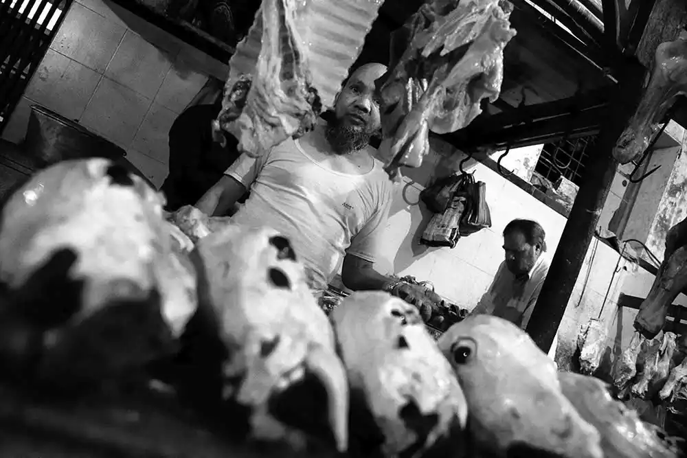 Varanasi, 2018 – “Benares is older than history, older than tradition, older even than legend and looks twice as old as all of them put together” (Mark Twain)Crawford market – I arrived at the Crawford market very early in the morning, well before people began to crowd the place, and went to the butcher section. It was a vast, dark ambiance, filled with piles of meet placed on the floor, releasing a pungent smell of blood. All around, hundreds of cawing crows. Mumbai, 2018.